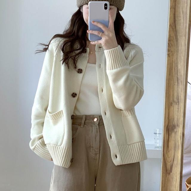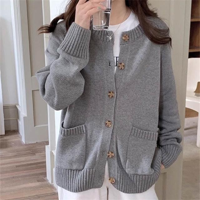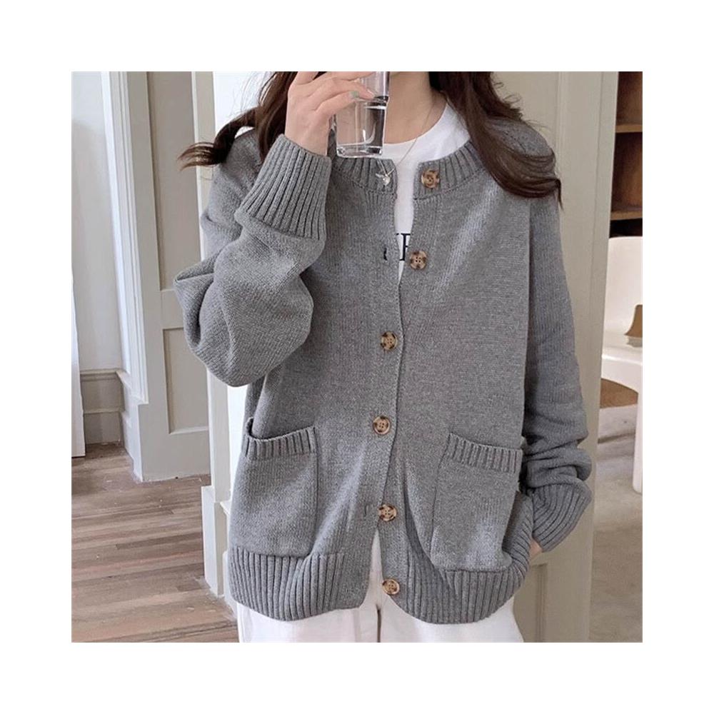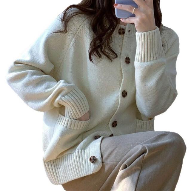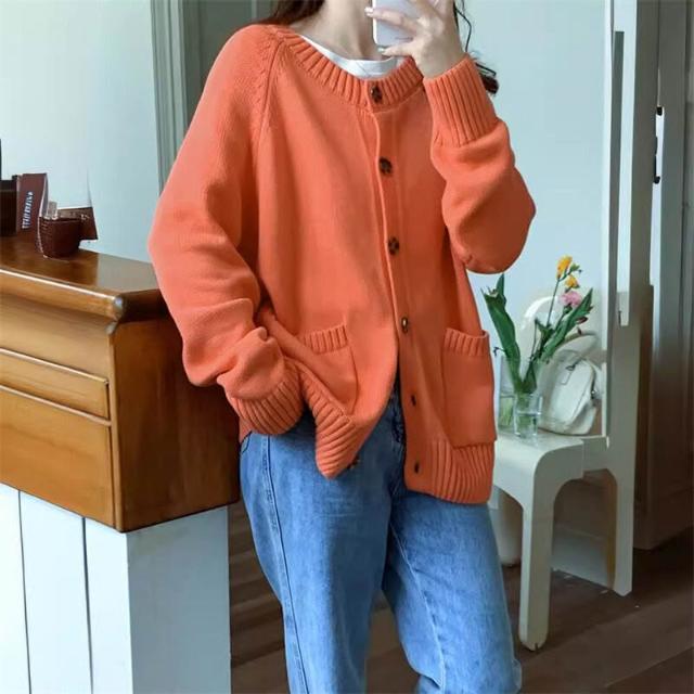 跨境新款秋冬季單排扣外套針織開衫女圓領寬松慵懶風純色軟糯毛衣 597