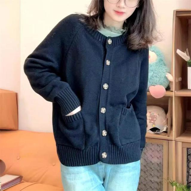 跨境新款秋冬季單排扣外套針織開衫女圓領寬松慵懶風純色軟糯毛衣 597