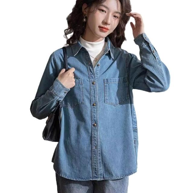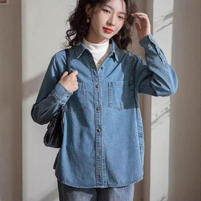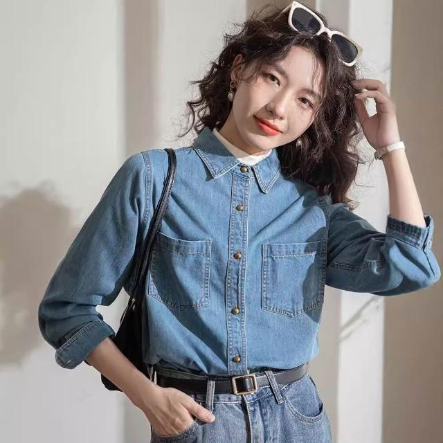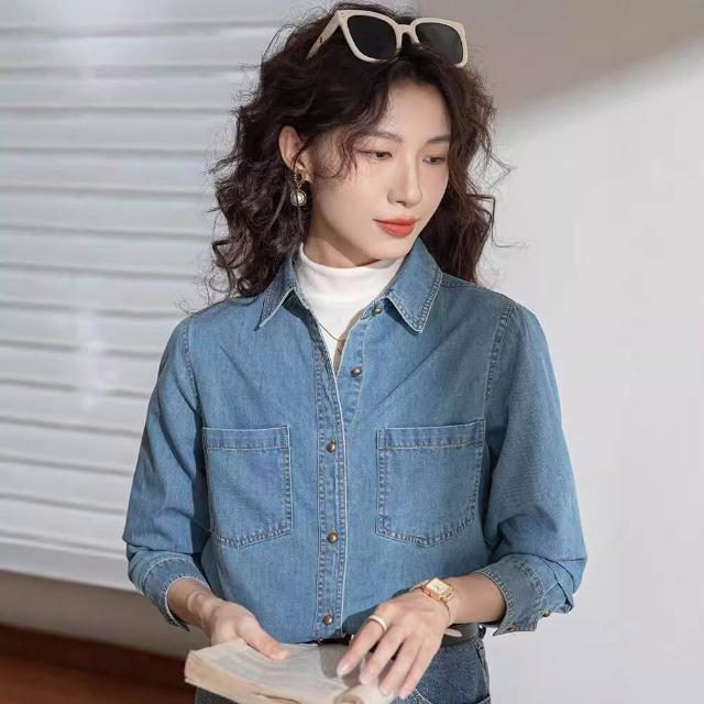 淺藍色軟牛仔襯衫女內搭疊穿正肩2024春秋新款開衫上衣文藝復古 0ca