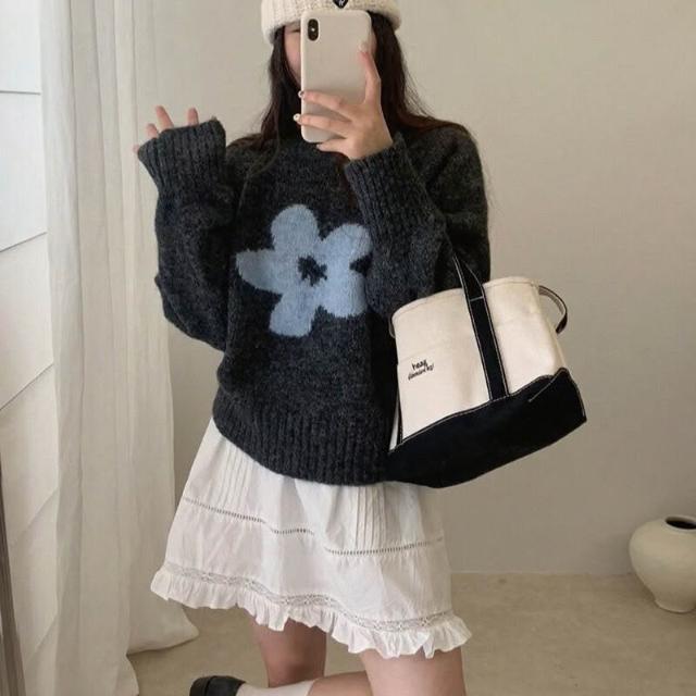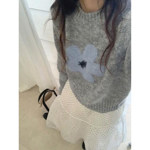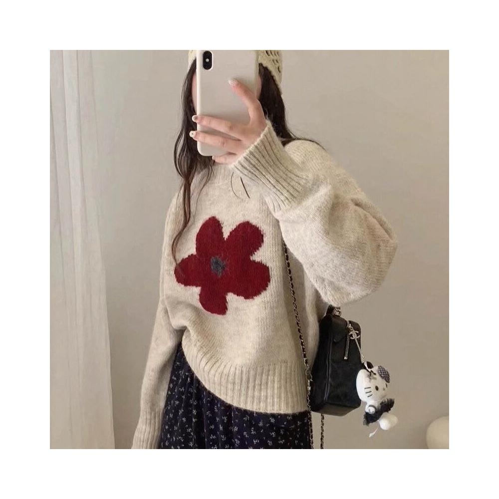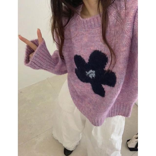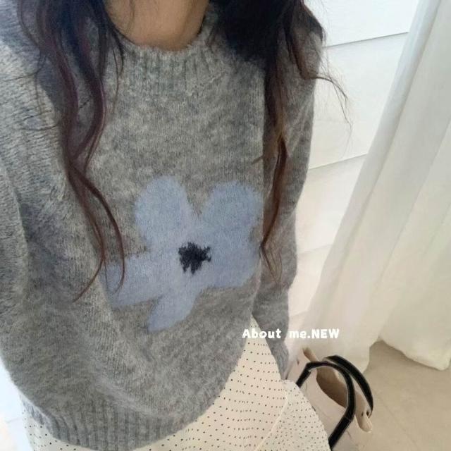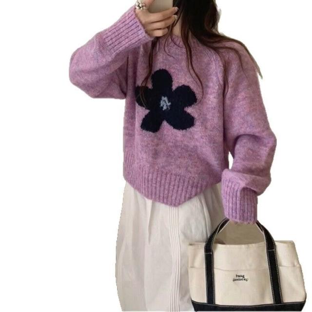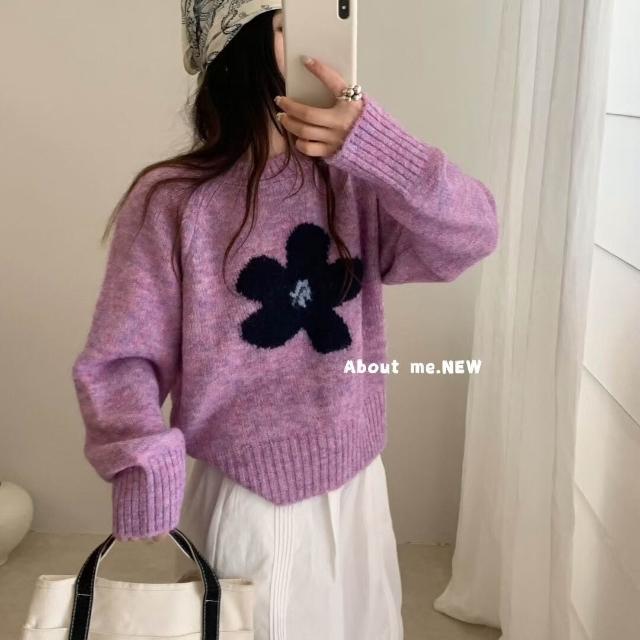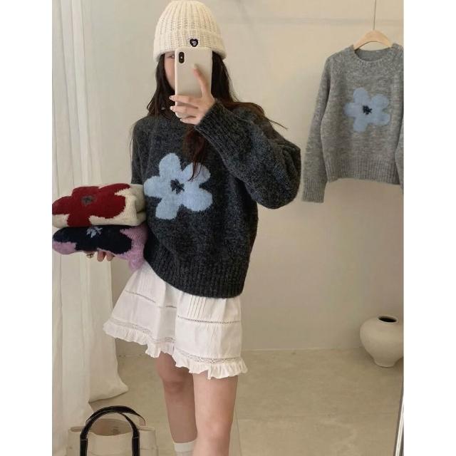 韓系羊駝絨花朵提花圓領毛衣女5秋冬新短套頭毛針織衫衣 484