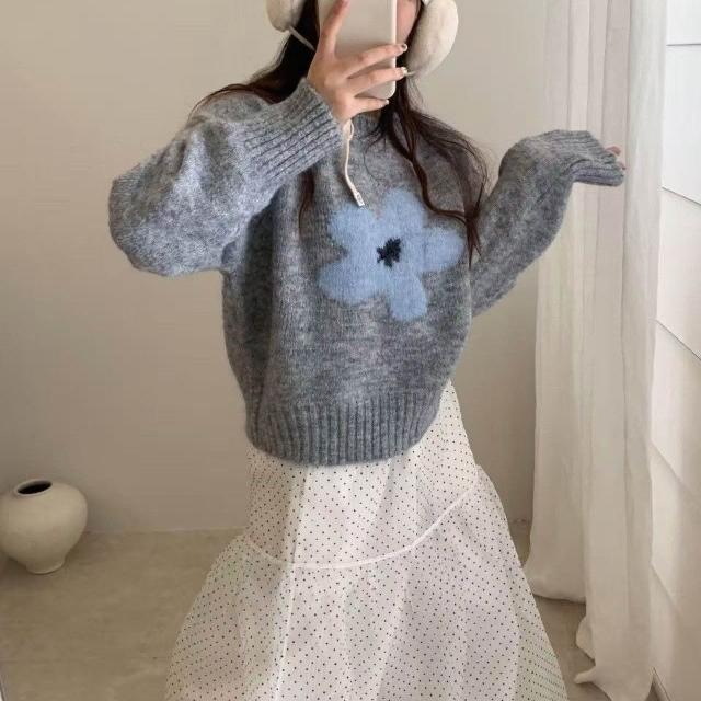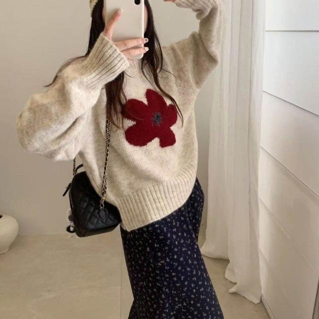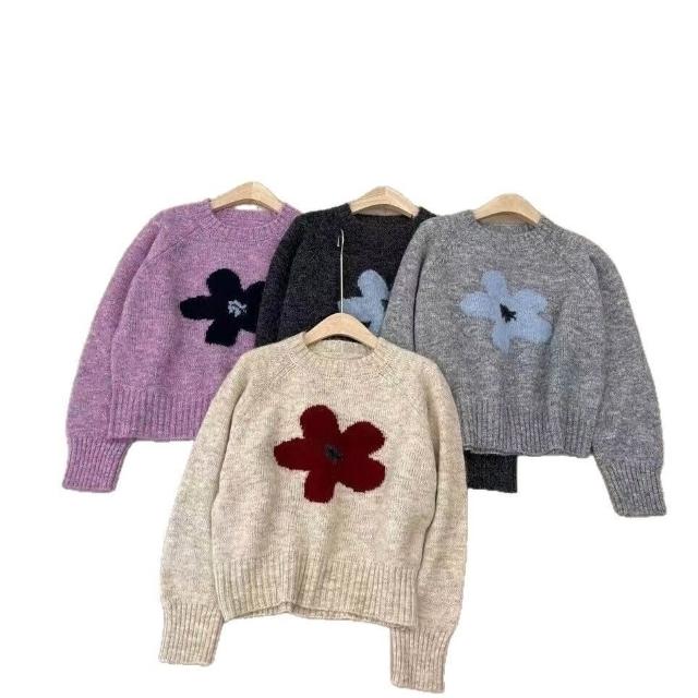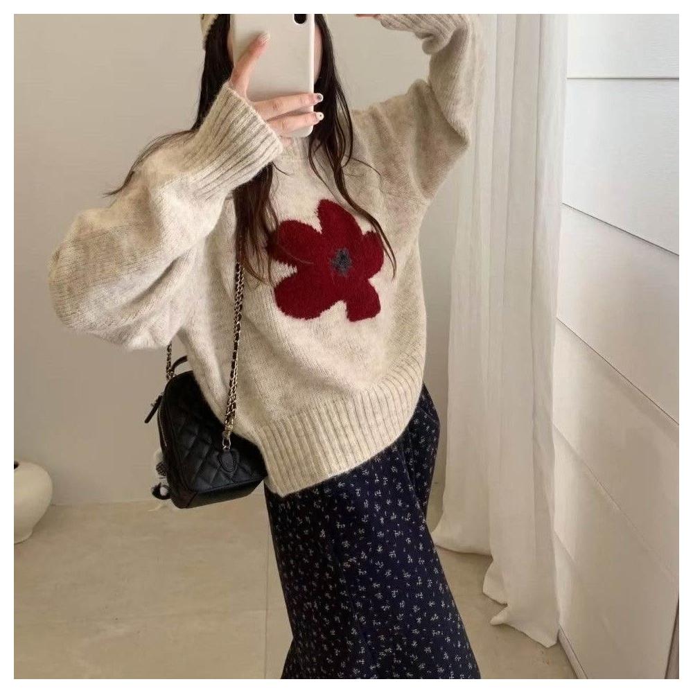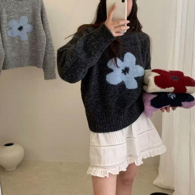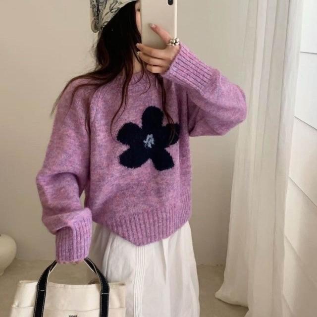 韓系短款花朵提花圓領毛衣寬松秋冬新款套頭針織衫顯瘦上衣女 fbe
