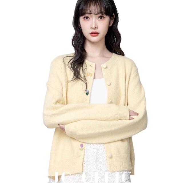黃色針織開衫女春秋2025新款寬松刺繡設計感薄款毛衣外套圓領上衣 a87