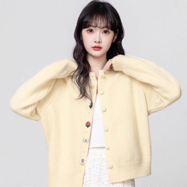 黃色針織開衫女春秋2025新款寬松刺繡設計感薄款毛衣外套圓領上衣 a87