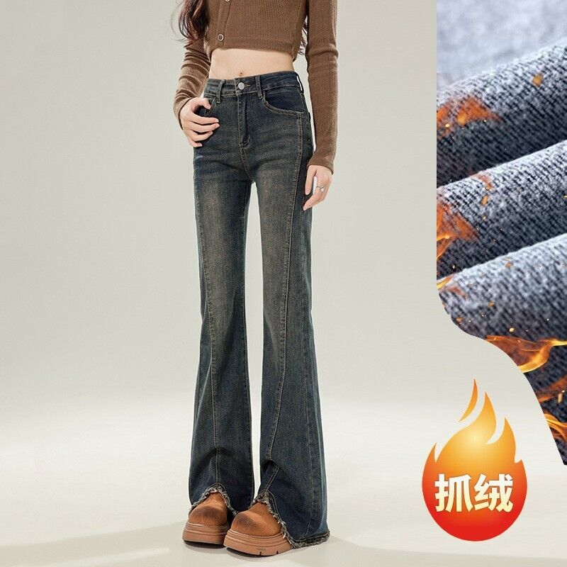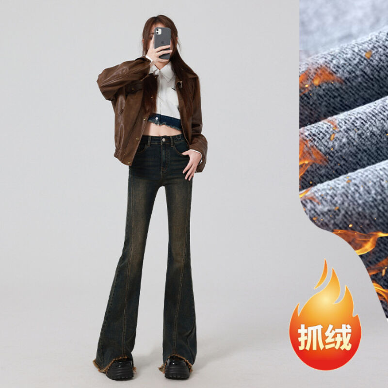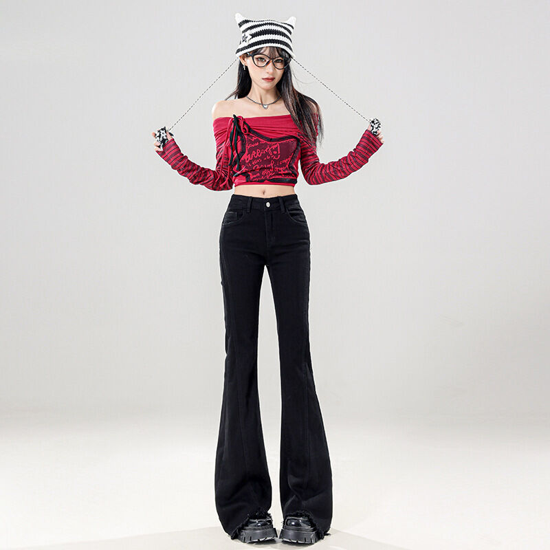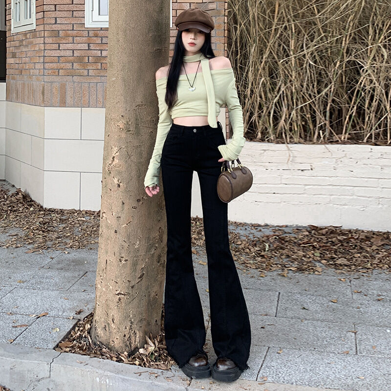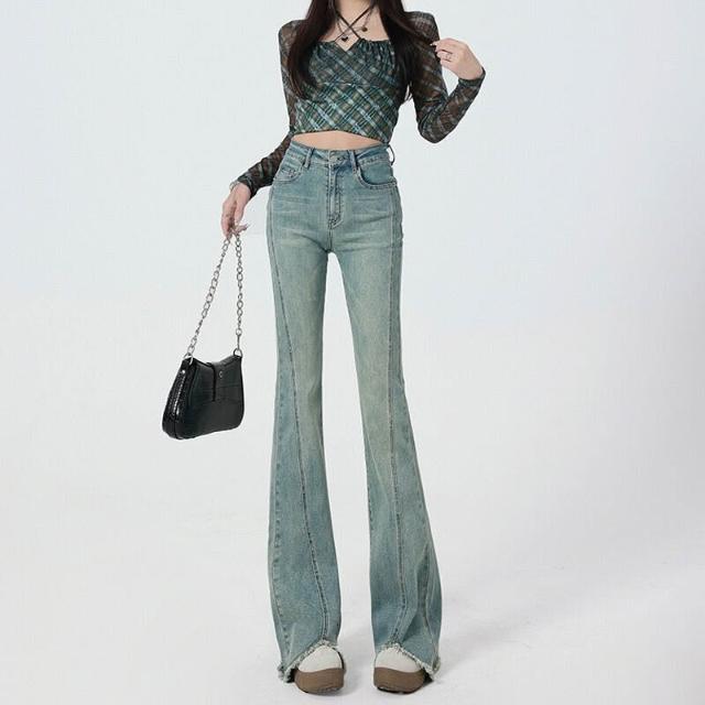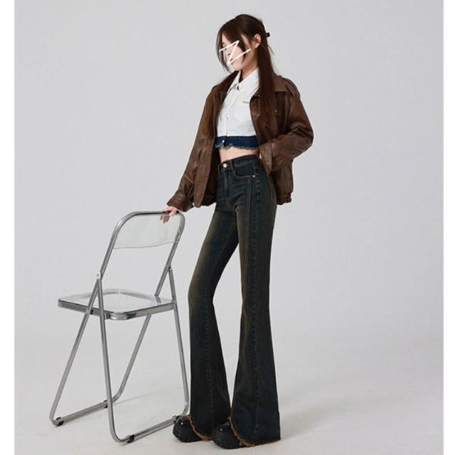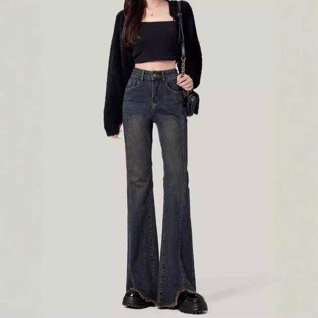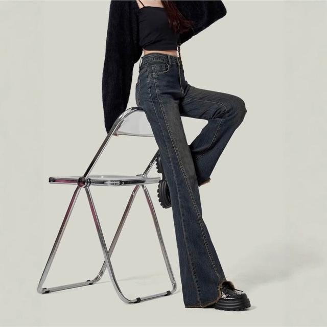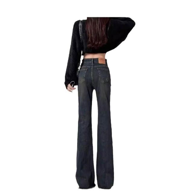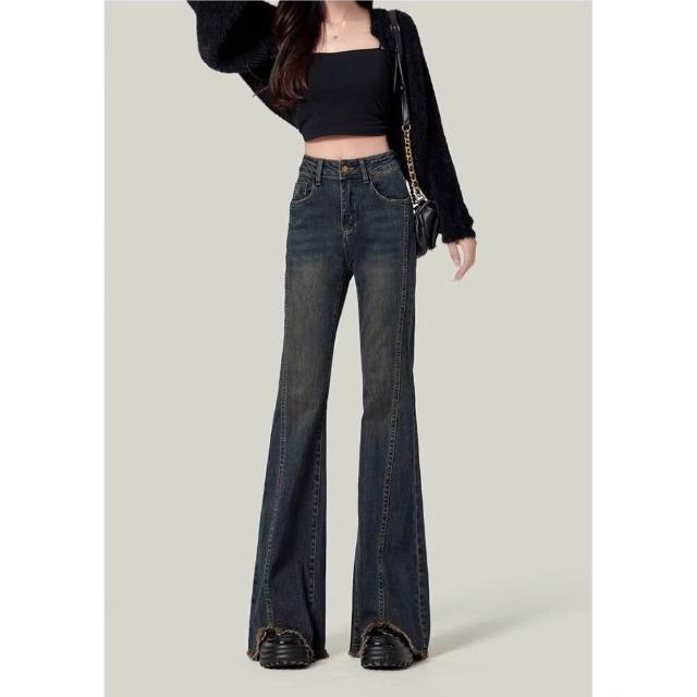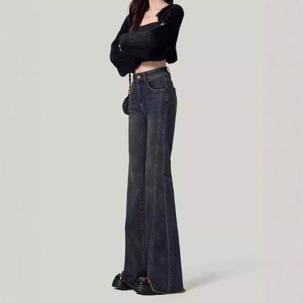 樂購小鋪 復古美式高腰納米灰微喇叭牛仔褲女2025春季彈力顯瘦馬蹄拖地長褲