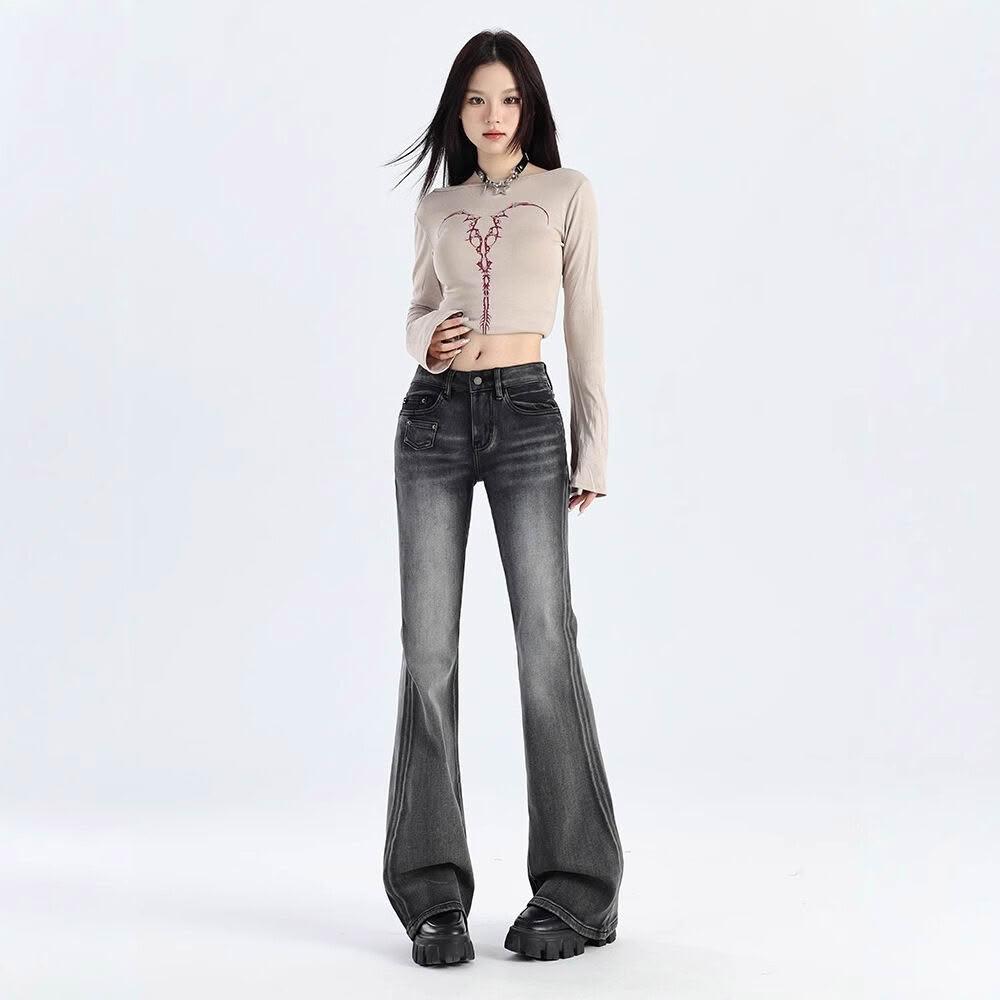 樂購小鋪 美式復古小眾口袋水洗折痕修身彈力微喇褲女低腰顯瘦百搭牛仔褲潮 58
