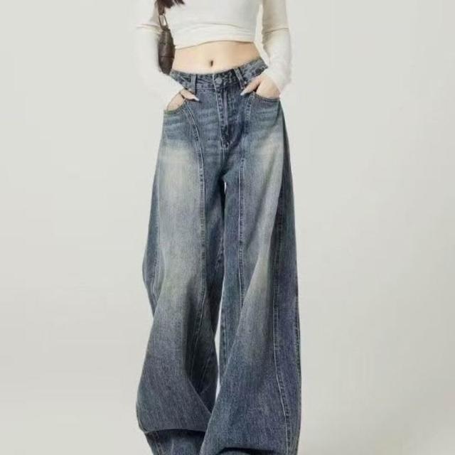 樂購小鋪 美式復古高街寬松闊腿牛仔褲女2025夏新款設計感高腰垂感彎刀褲子 790