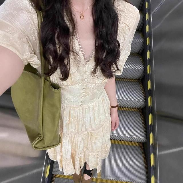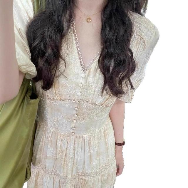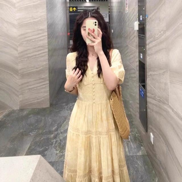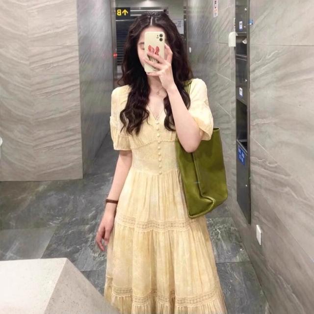 樂購小鋪 現貨 茶歇法式V領黃色泡泡袖連衣裙女夏季2025新款氣質收腰裙子 690