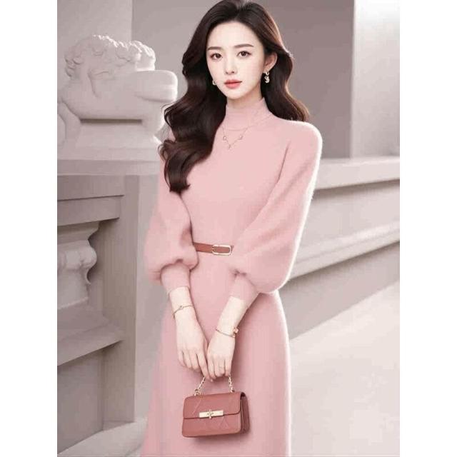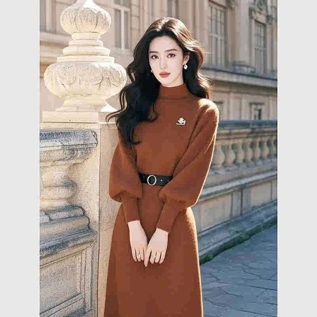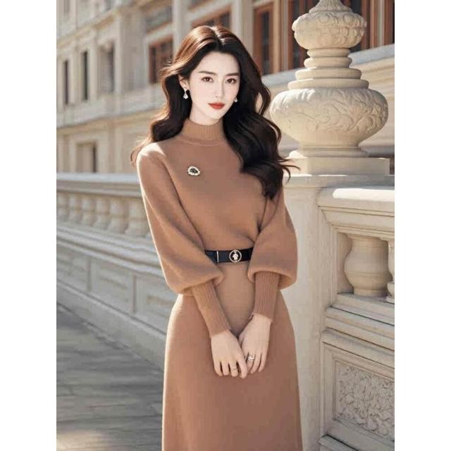 樂購小鋪 法式氣質名媛高端女神範高級感富家千金咖色針織內搭連衣裙子秋冬 d56