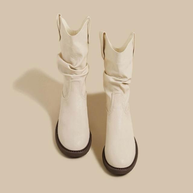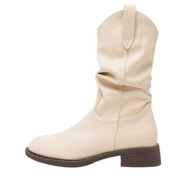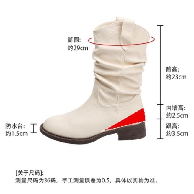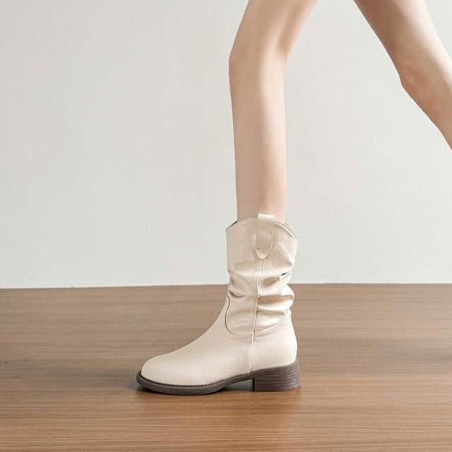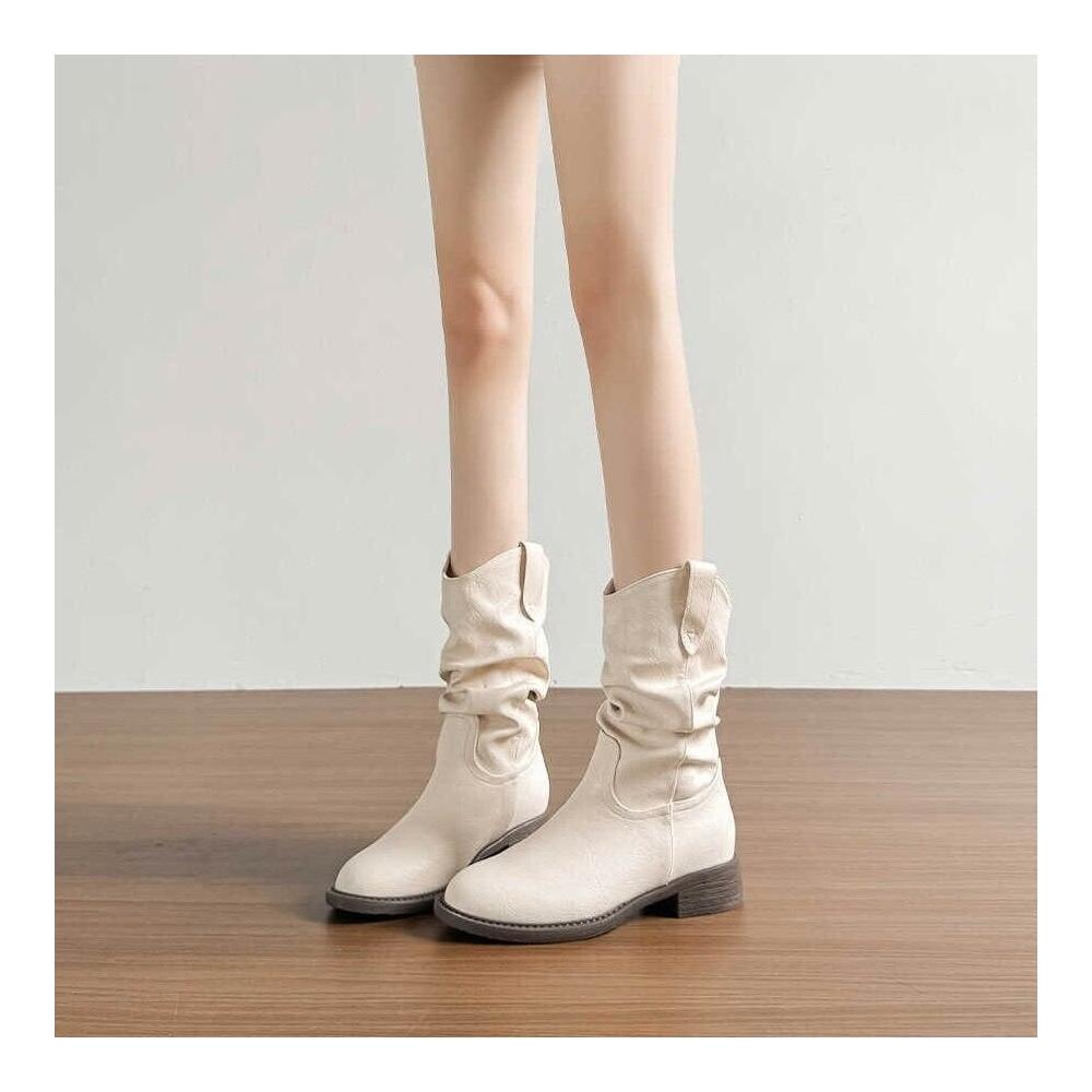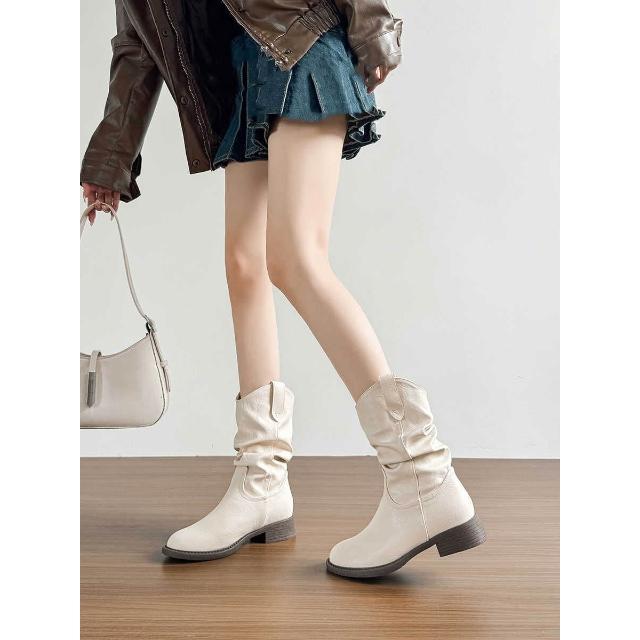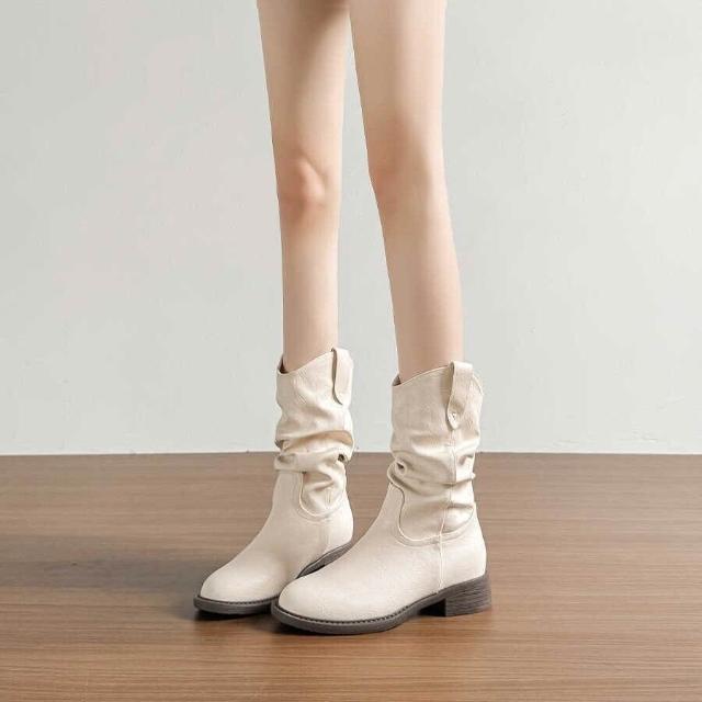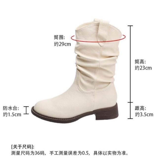 樂購小鋪 現貨~復古美拉德白色短靴女2025新款粗跟褶皺堆堆靴內增高馬丁靴 84