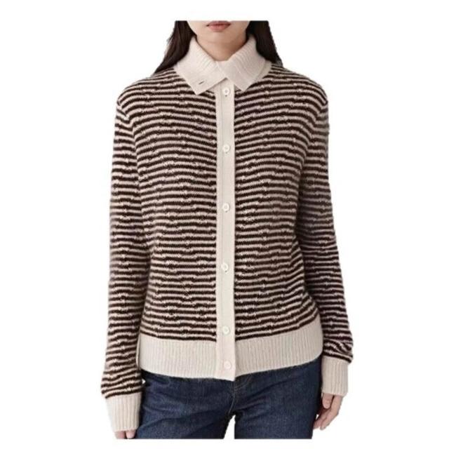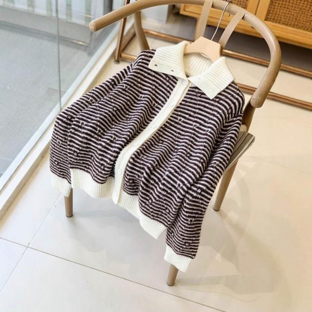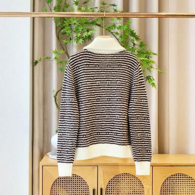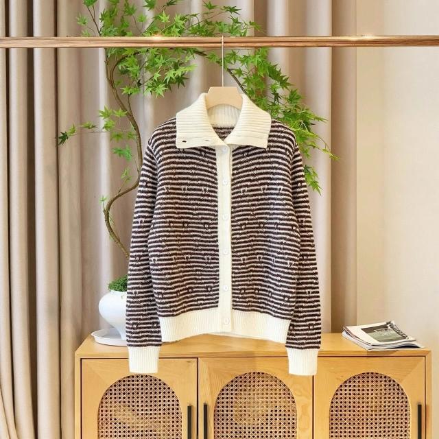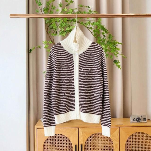 樂購小鋪 現貨 通勤簡約百搭撞色條紋針織開衫女翻領毛衣外套秋冬新款 1939 715