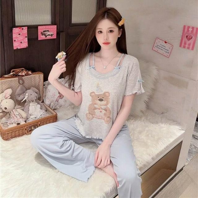 樂購小鋪 睡衣女細螺紋莫代爾棉蛋糕熊印花短袖短褲長褲三件套裝胸棉家居服 8