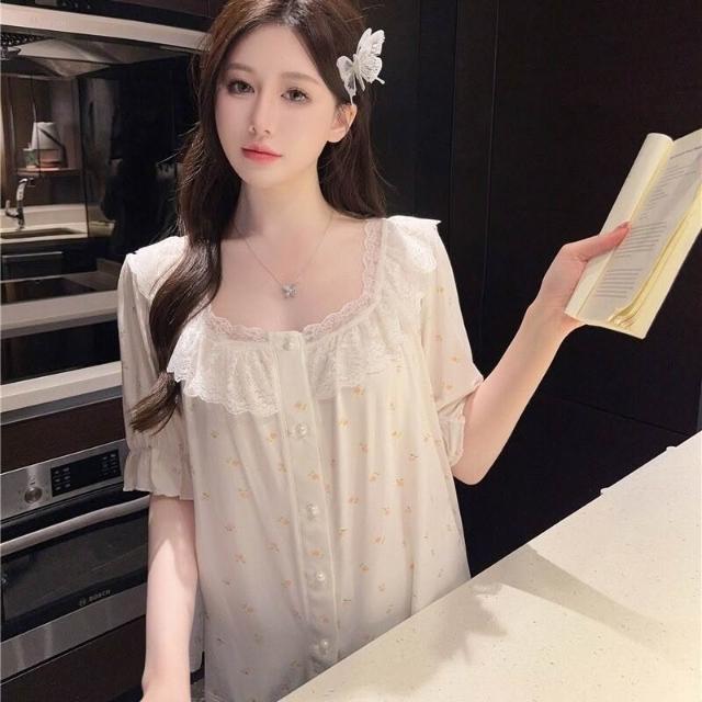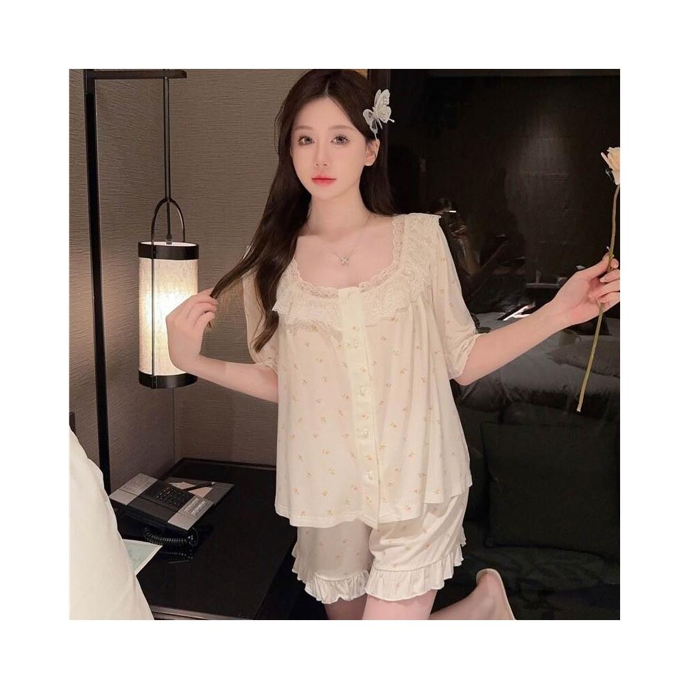 樂購小鋪 睡衣女新夏季莫代爾棉碎花蕾絲可外穿舒適短袖短褲兩件套家居服 4 3