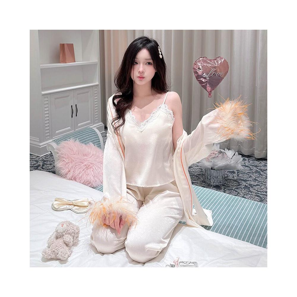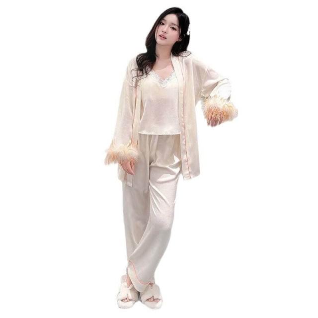 樂購小鋪 睡衣女春秋款冰絲長袖大碼米手抓花三件套裝夏季高級感純色家居服 054