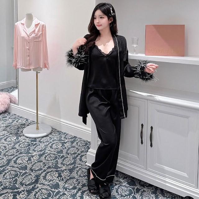 樂購小鋪 睡衣女春秋款冰絲長袖大碼米手抓花三件套裝夏季高級感純色家居服 054