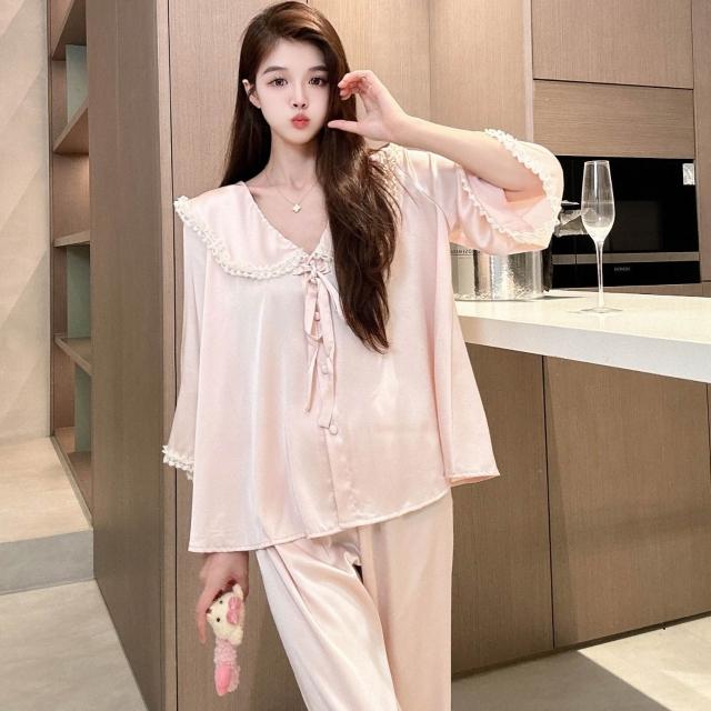 樂購小鋪 法式蕾絲花邊藍色涼感冰絲睡衣女春秋大碼公主風舒適親膚家居套裝 43