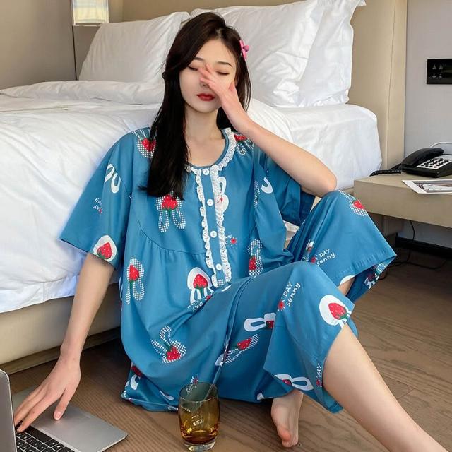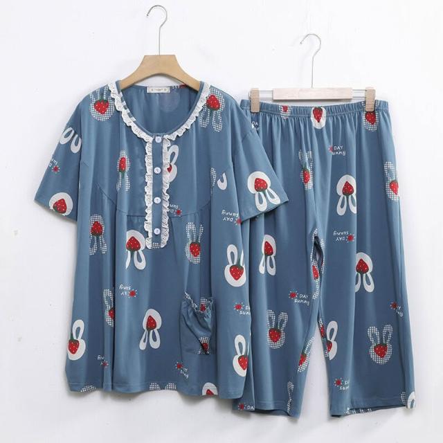 樂購小鋪 夏季薄款睡衣印花圓領短袖五分褲兩件套女士大碼棉卡通可愛家居服
