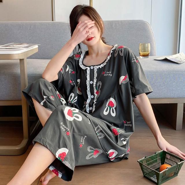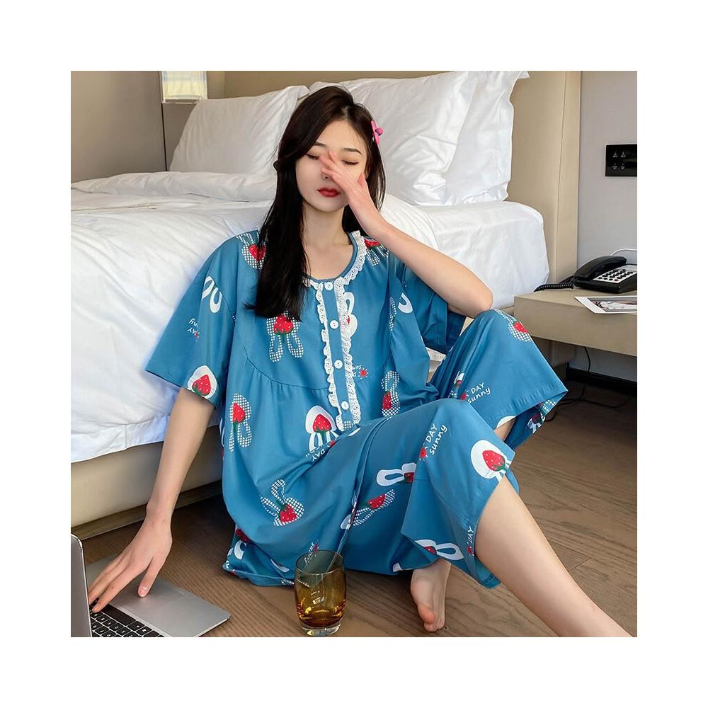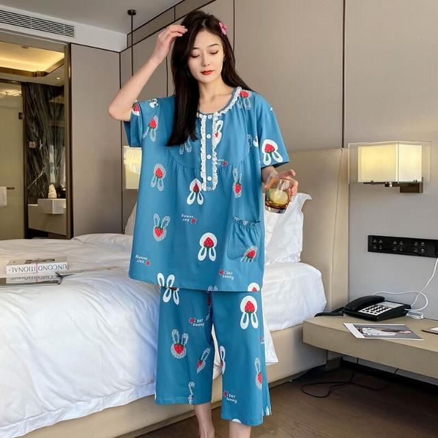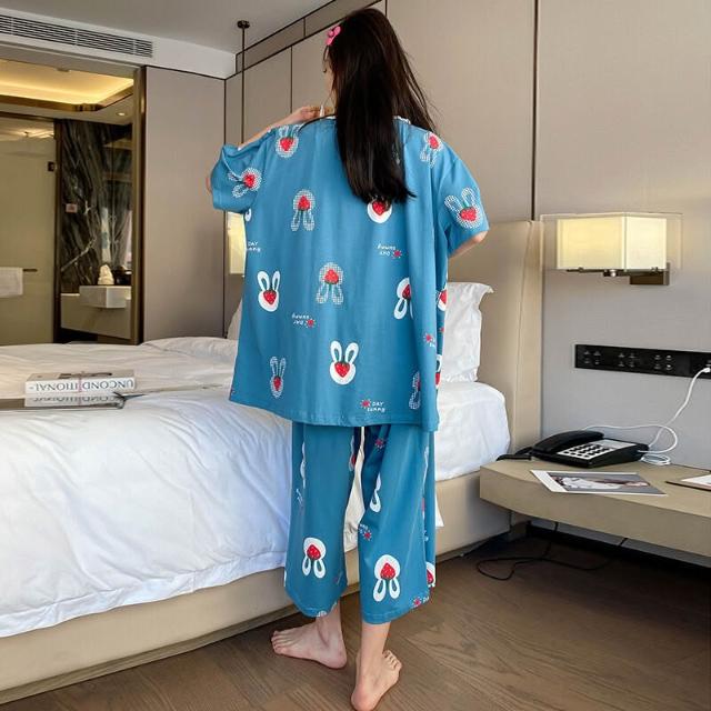 樂購小鋪 夏季薄款睡衣印花圓領短袖五分褲兩件套女士大碼棉卡通可愛家居服