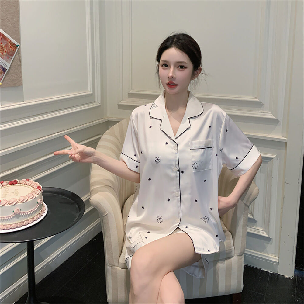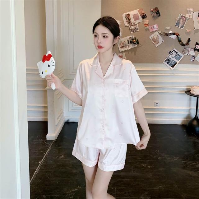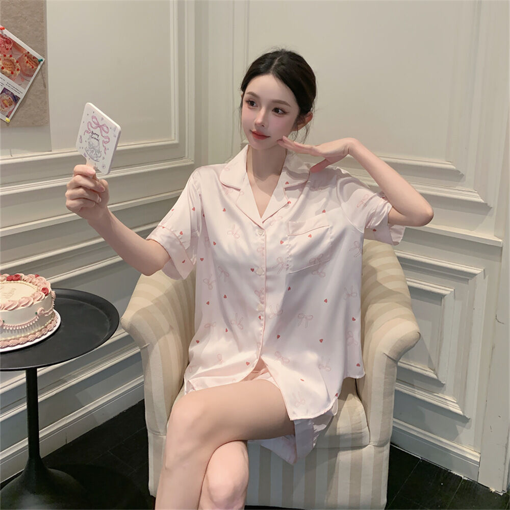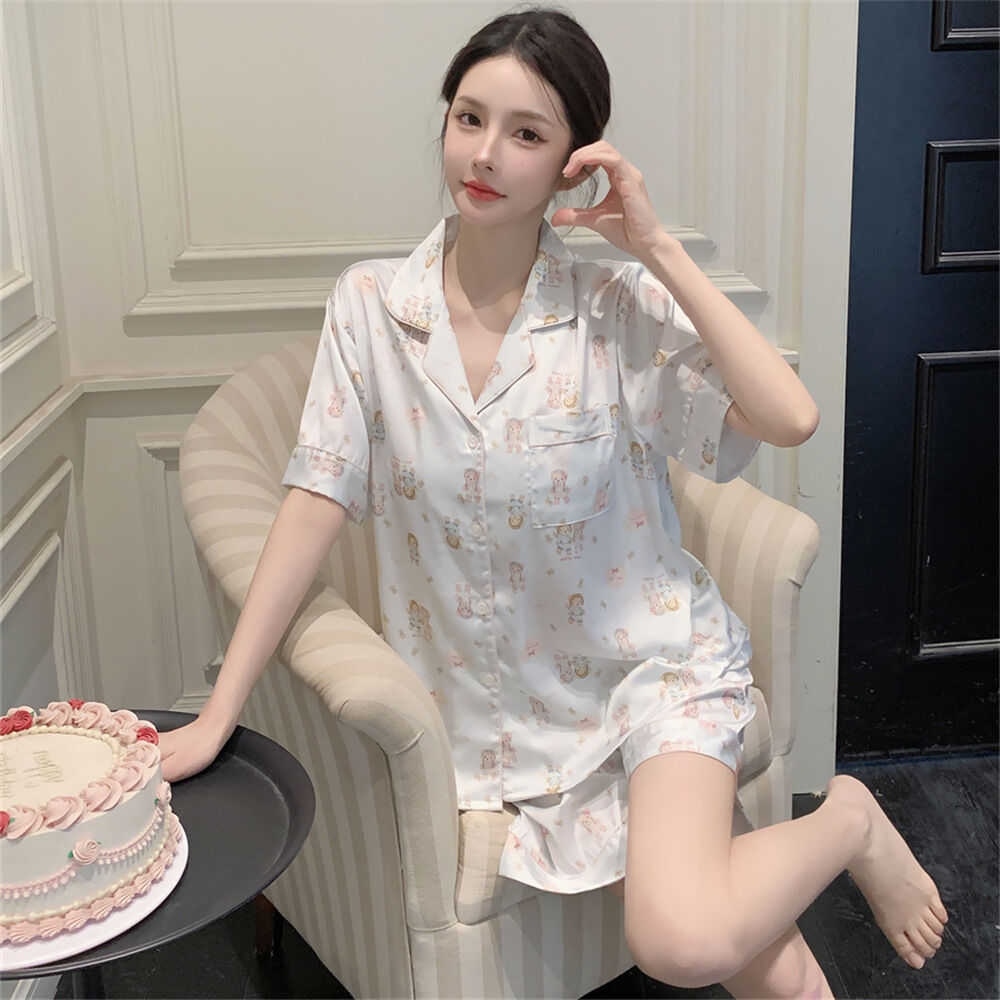 樂購小鋪 冰絲睡衣女春夏季薄款短袖短褲開衫套裝可愛印花家居服批發可代發 0