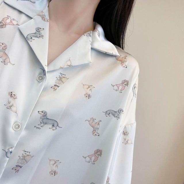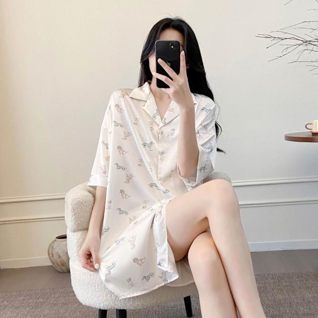 樂購小鋪 睡衣女春夏季新款短袖休閑時尚冰絲寸衫睡裙甜美印花薄款家居服女 421
