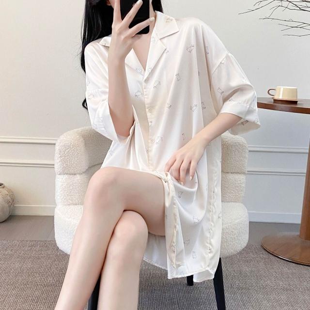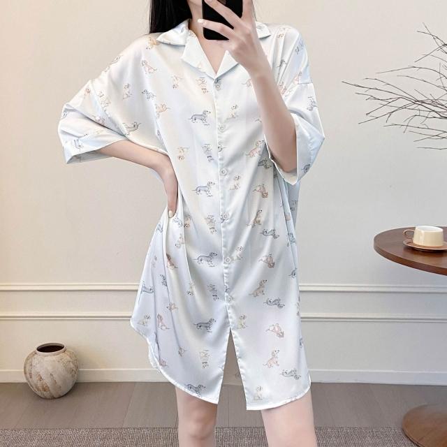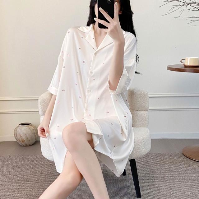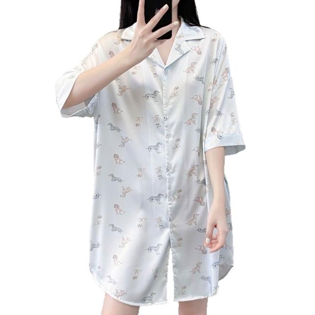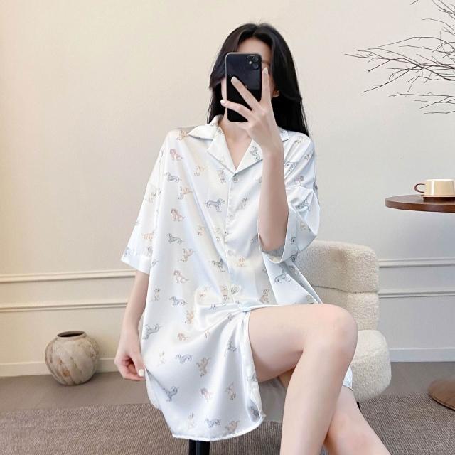 樂購小鋪 睡衣女春夏季新款短袖休閑時尚冰絲寸衫睡裙甜美印花薄款家居服女 421