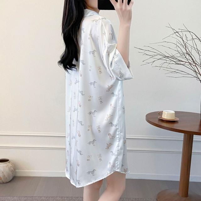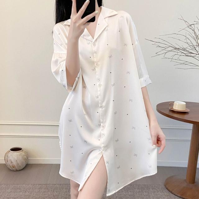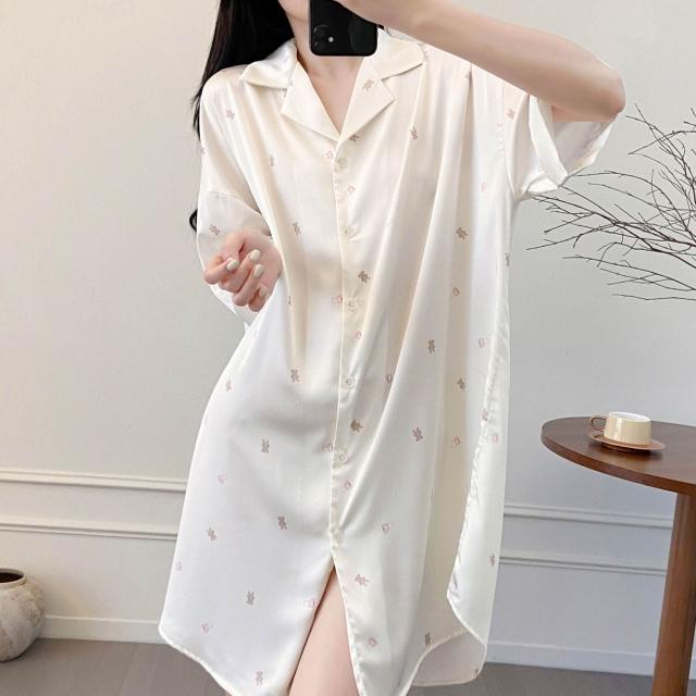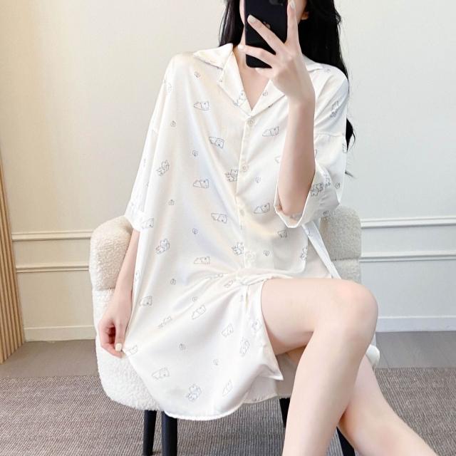 樂購小鋪 睡衣女春夏季新款短袖休閑時尚冰絲寸衫睡裙甜美印花薄款家居服女 421