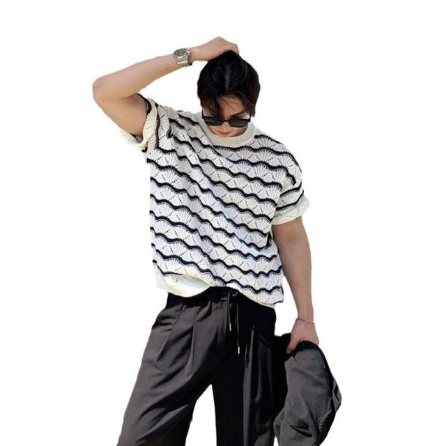 樂購小鋪 短袖條紋 恤男夏季透氣薄款圓領镂空針織衫美式復古半袖寬松體恤 810