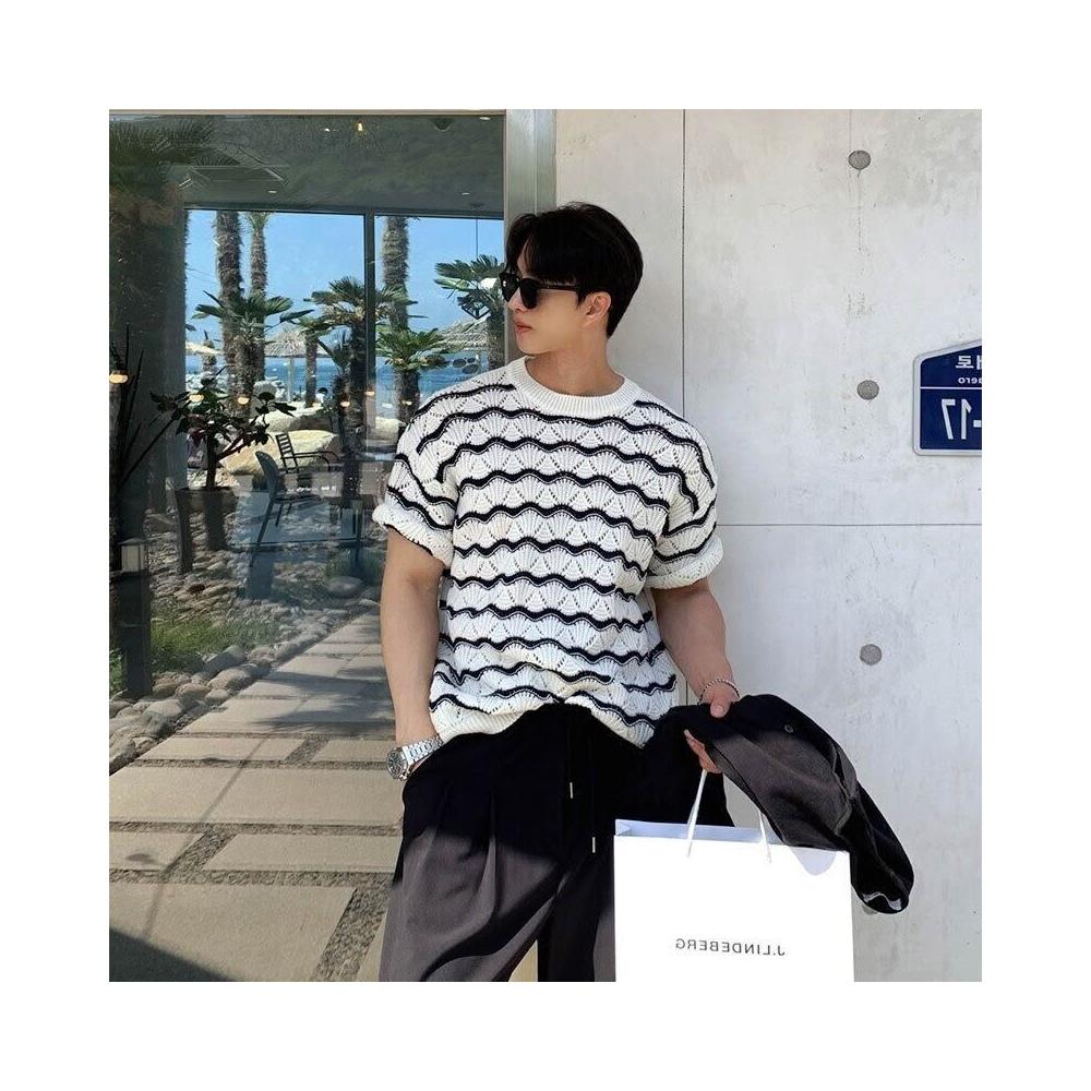樂購小鋪 短袖條紋 恤男夏季透氣薄款圓領镂空針織衫美式復古半袖寬松體恤 810