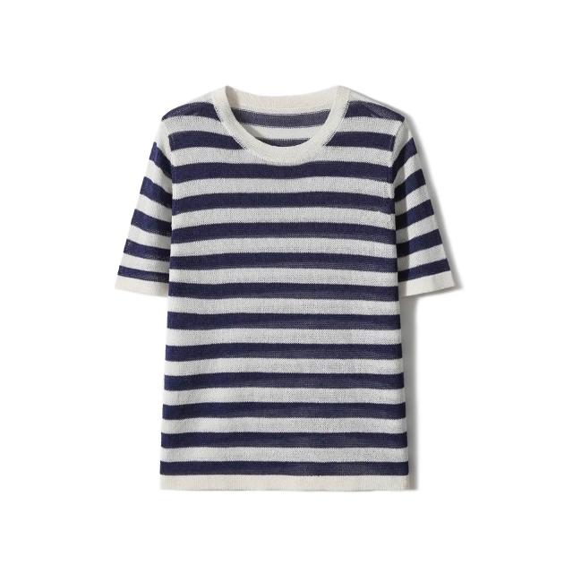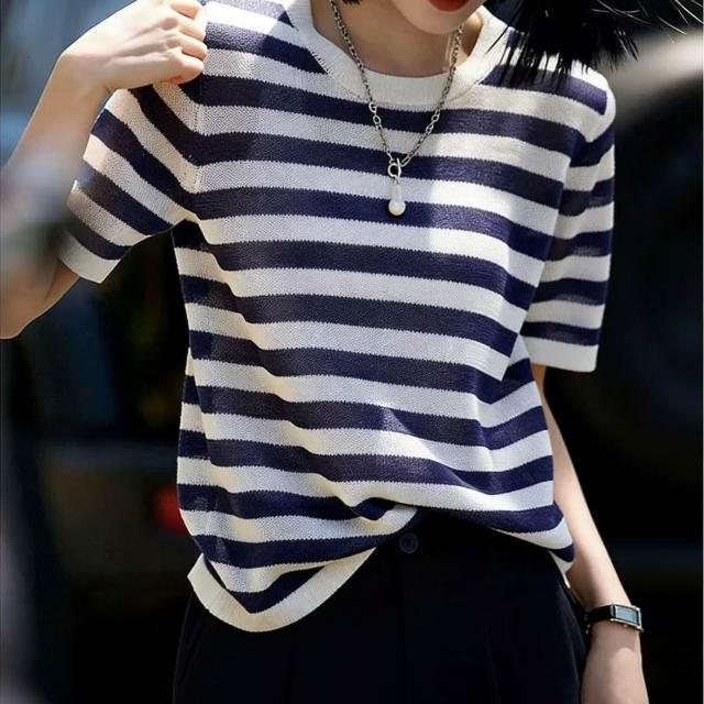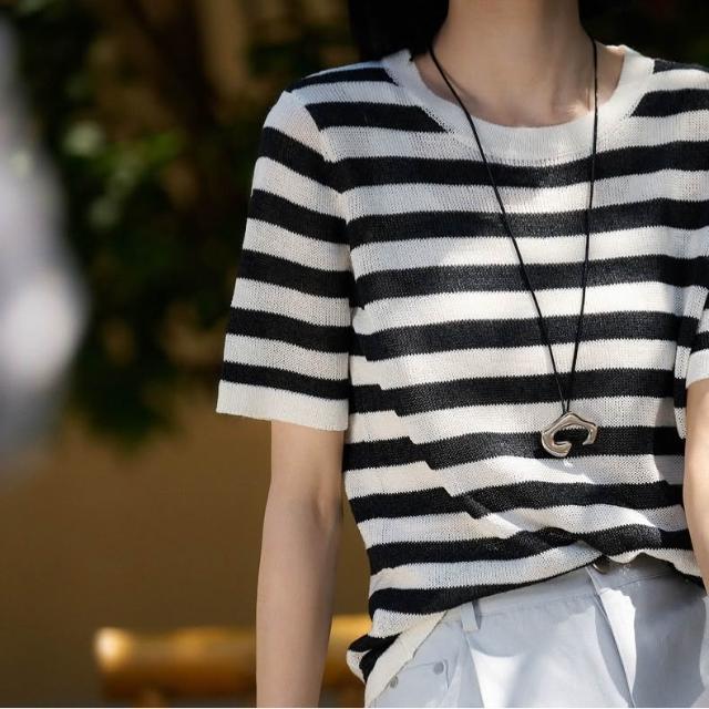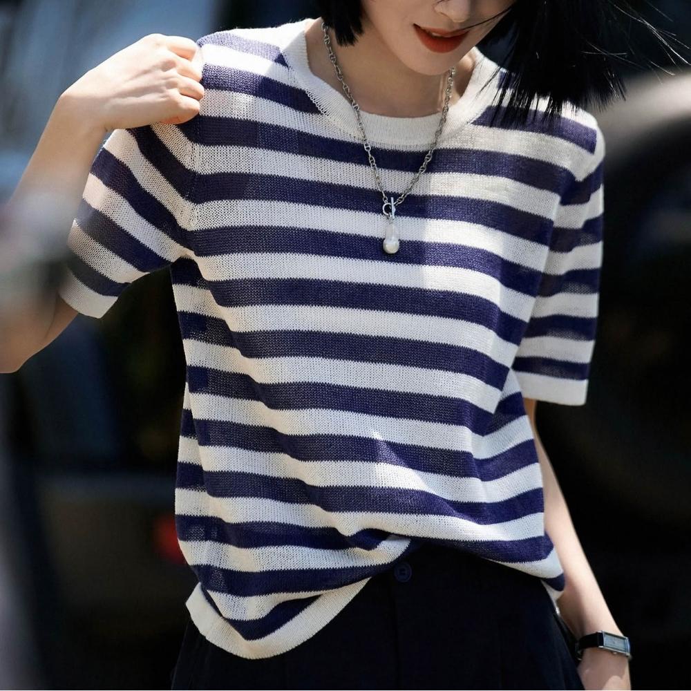 樂購小鋪 春夏新款條紋針織衫短袖 恤女式圓領透氣薄款套頭內搭設計感上衣