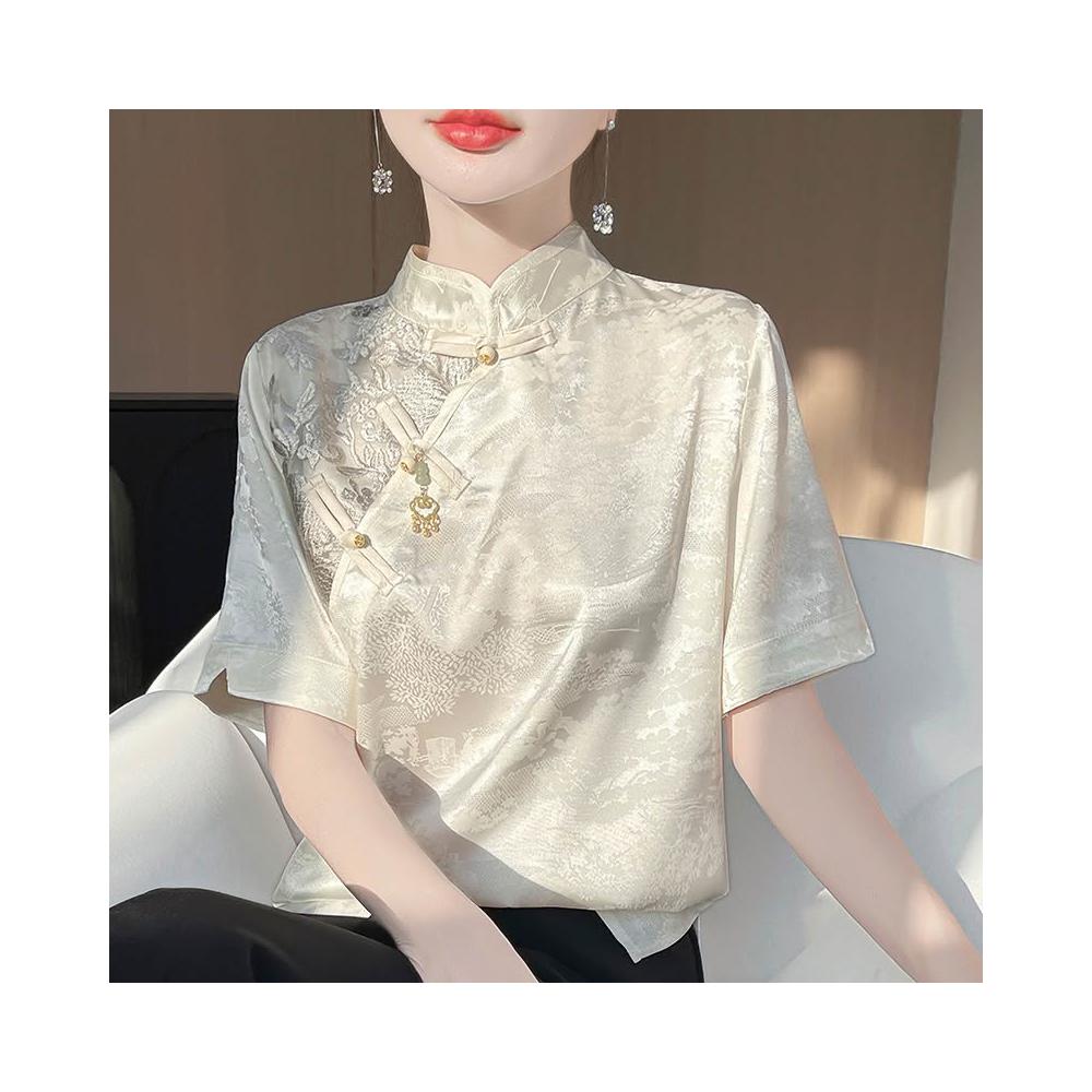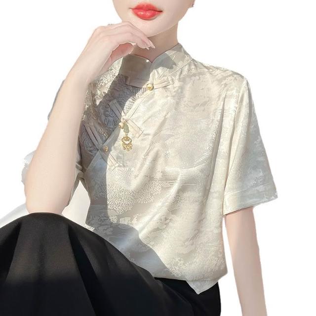 樂購小鋪 新中式國風緞面桑蠶絲立領短袖襯衫夏季新立領盤衣復古襯衣高級感 61