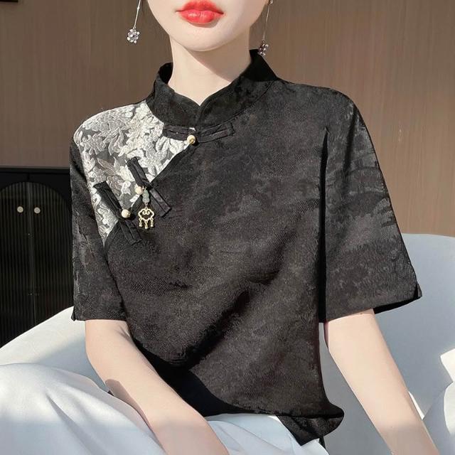 樂購小鋪 新中式國風緞面桑蠶絲立領短袖襯衫夏季新立領盤衣復古襯衣高級感 61