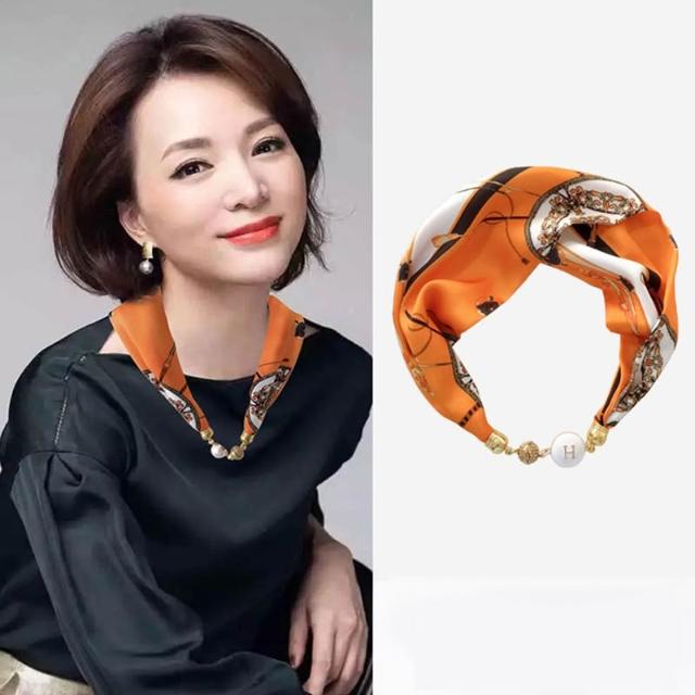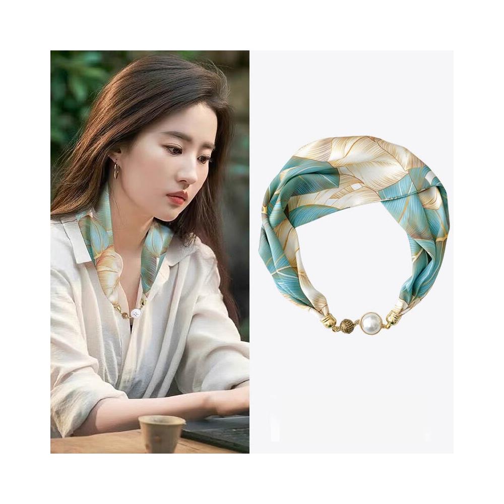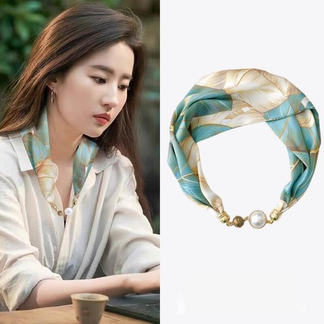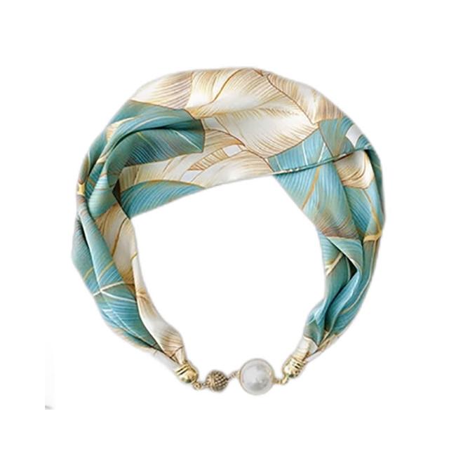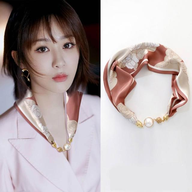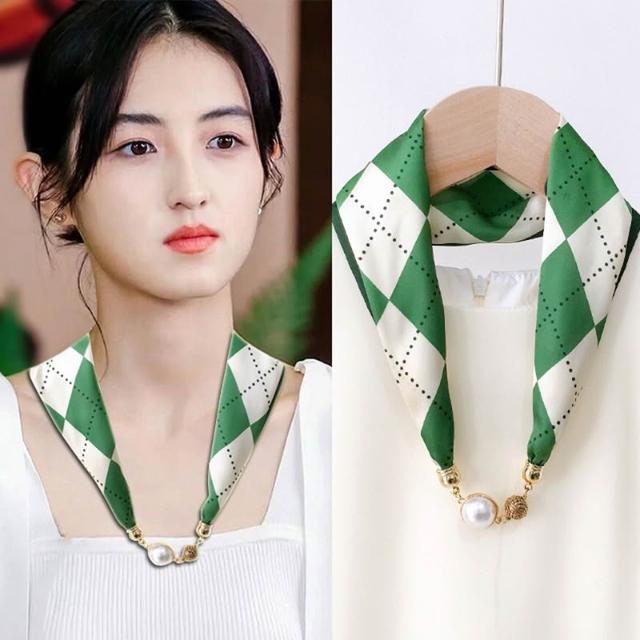 樂購小鋪 新款珍珠磁扣長條項鏈小絲巾女簡約春夏裝飾領巾春秋復古百搭圍巾 0