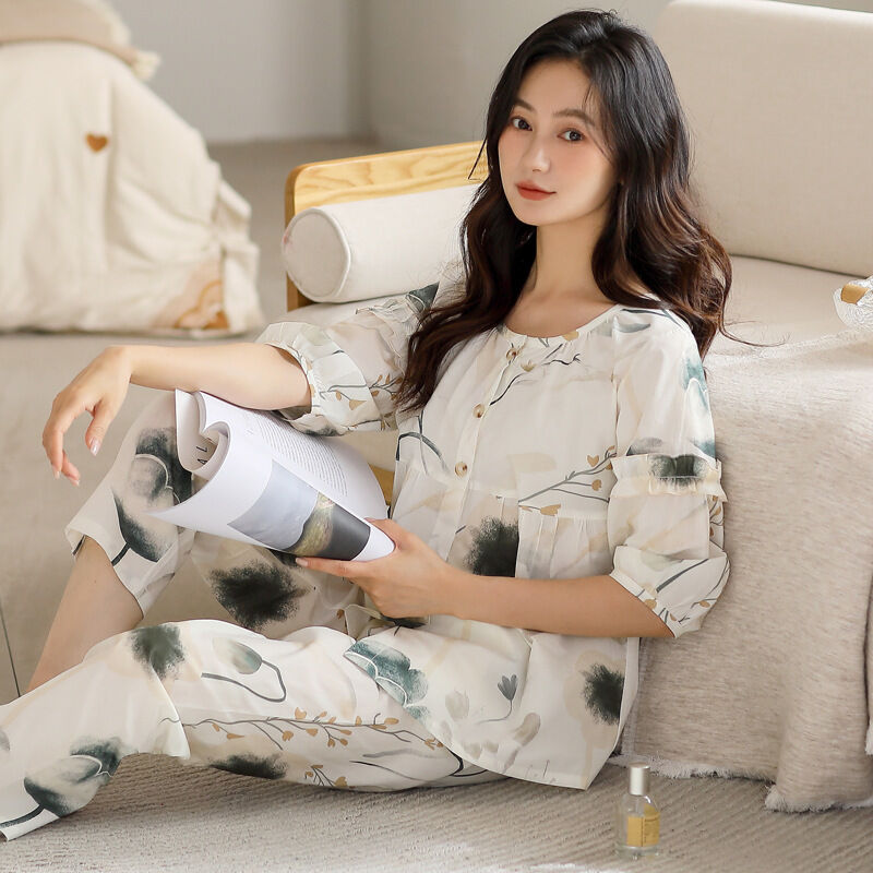 簡優 梭織棉睡衣女夏季紗布純棉短袖長褲薄款加大碼中老年媽媽女家居服