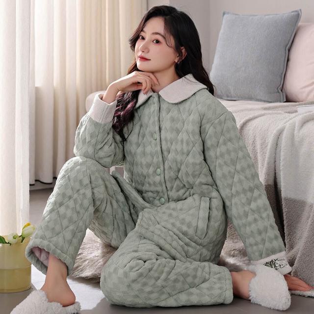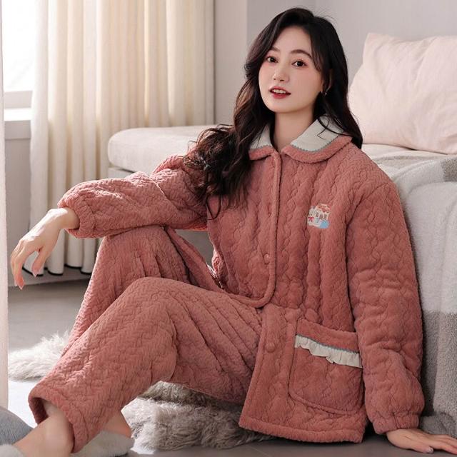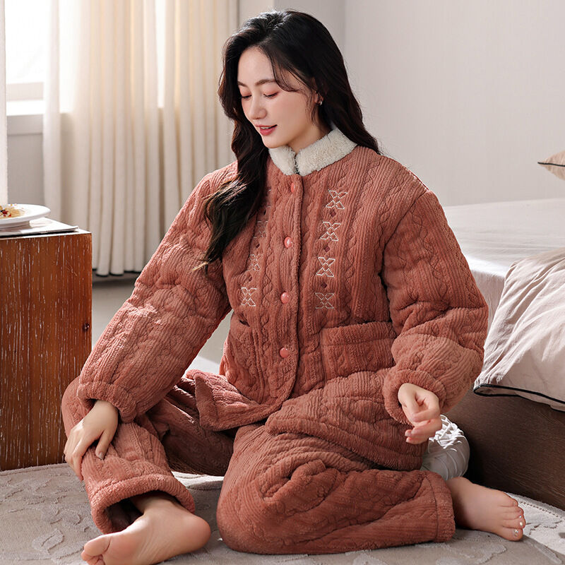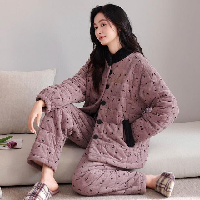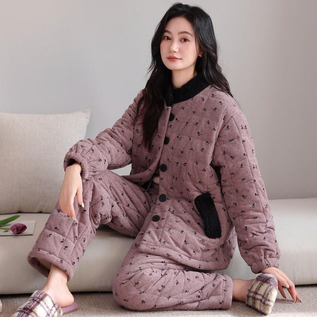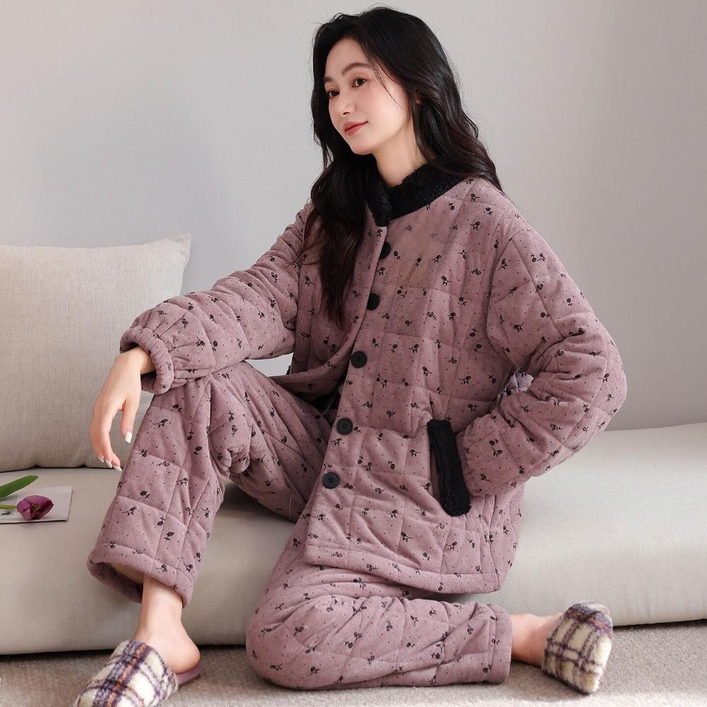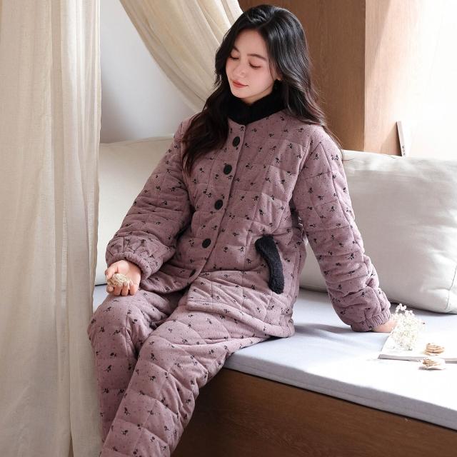 簡優 睡衣女冬季珊瑚絨三層加厚加絨夾棉秋冬法蘭絨超厚冬款媽媽家居服