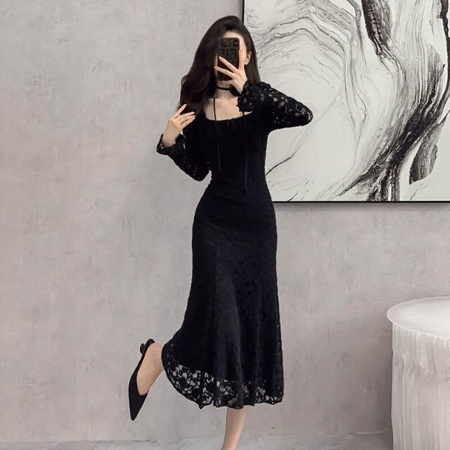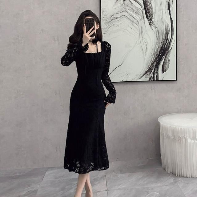 簡優 靓依軒 法式提花蕾絲連衣裙女秋冬新款設計感別致魚尾長裙子