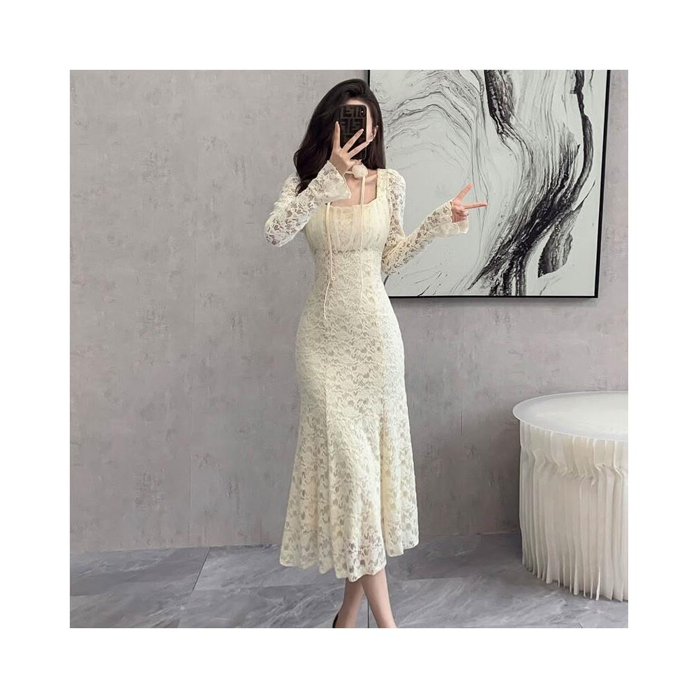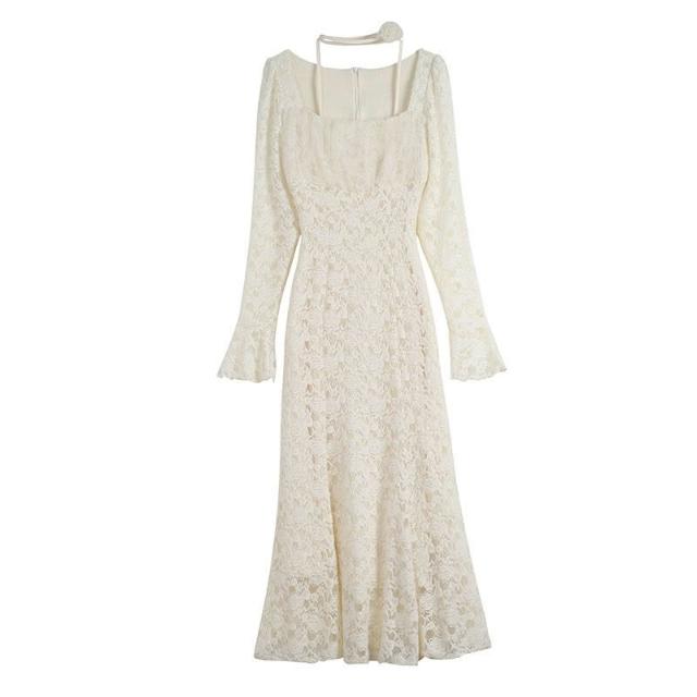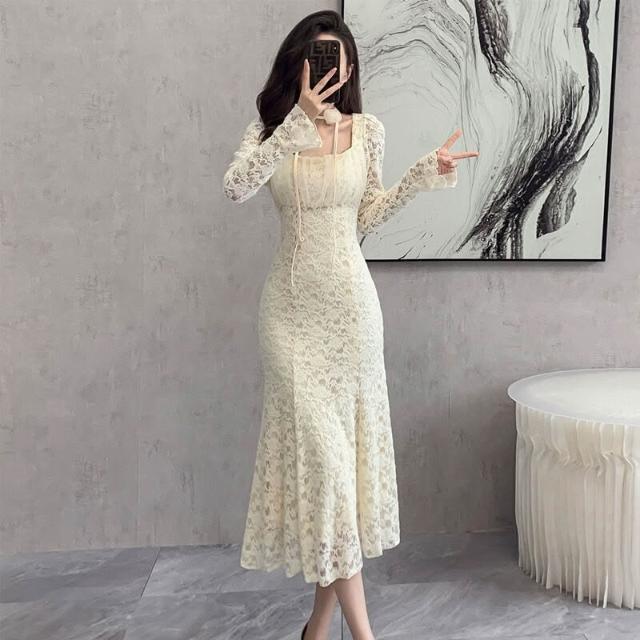 簡優 靓依軒 法式提花蕾絲連衣裙女秋冬新款設計感別致魚尾長裙子