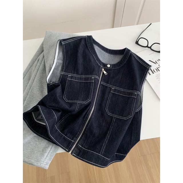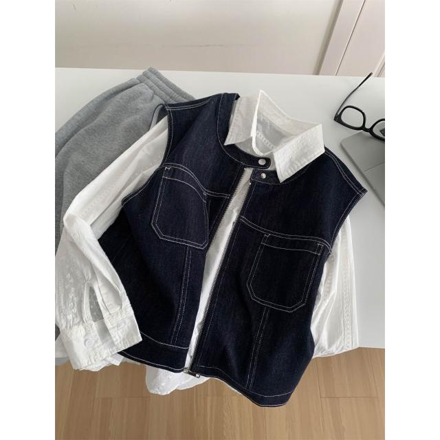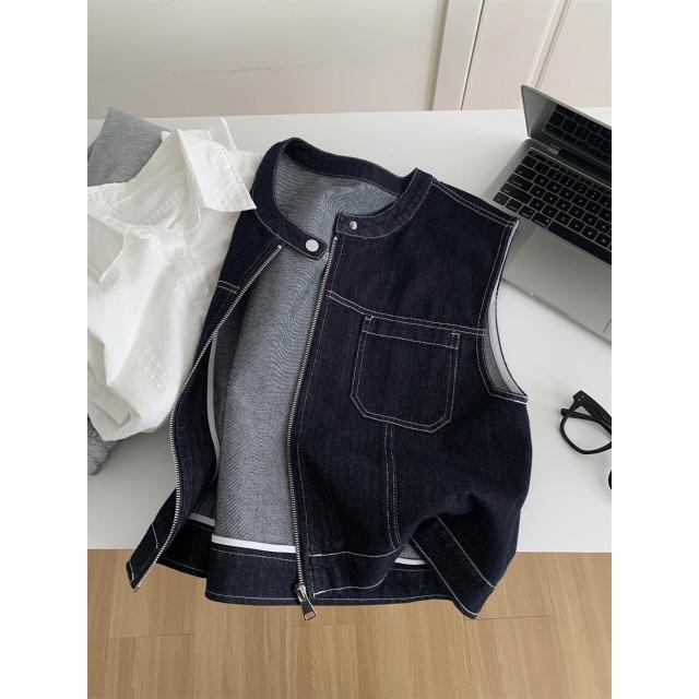 簡優 時髦高街明線牛仔馬甲女26春秋天絲棉拉鏈開衫外套洋氣疊背心馬夾