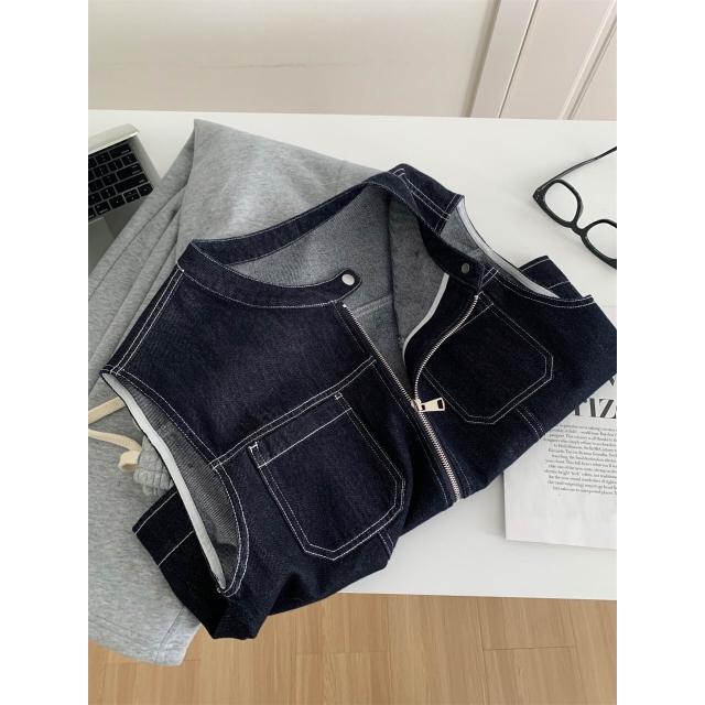 簡優 時髦高街明線牛仔馬甲女26春秋天絲棉拉鏈開衫外套洋氣疊背心馬夾