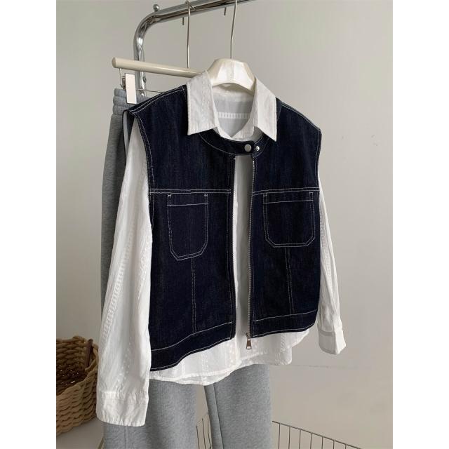 簡優 時髦高街明線牛仔馬甲女26春秋天絲棉拉鏈開衫外套洋氣疊背心馬夾