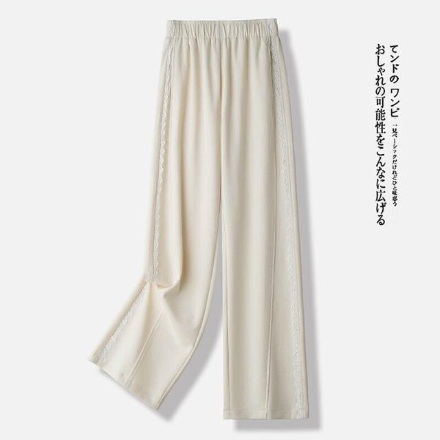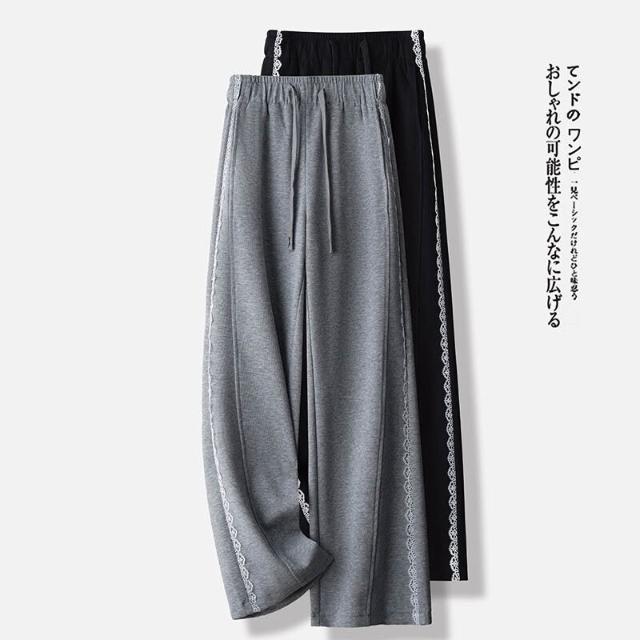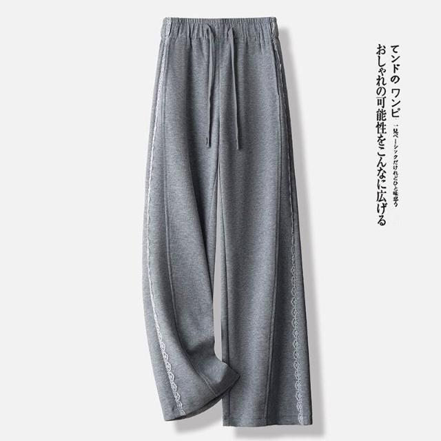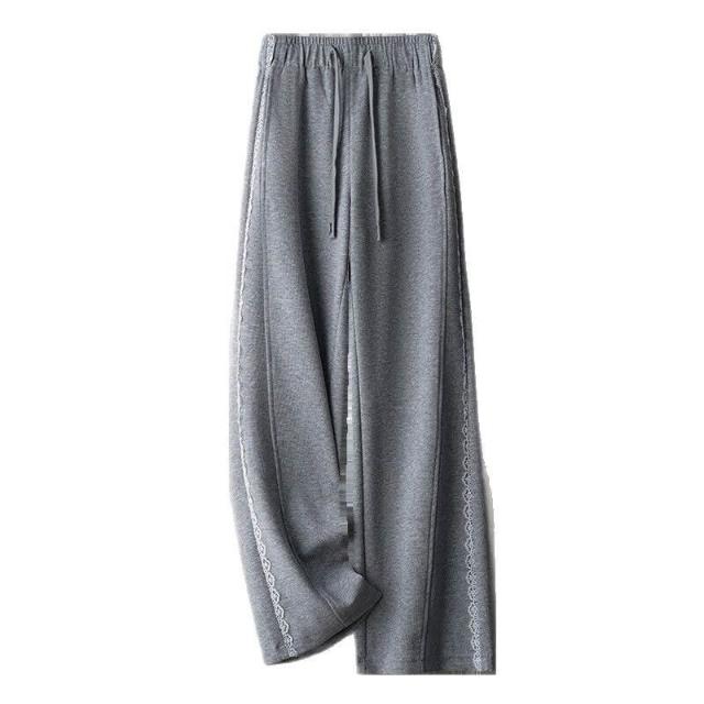 簡優 灰色蕾絲花邊休閑直筒衛褲女2026春季新款抽繩高腰寬松運動闊腿褲