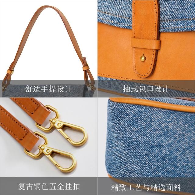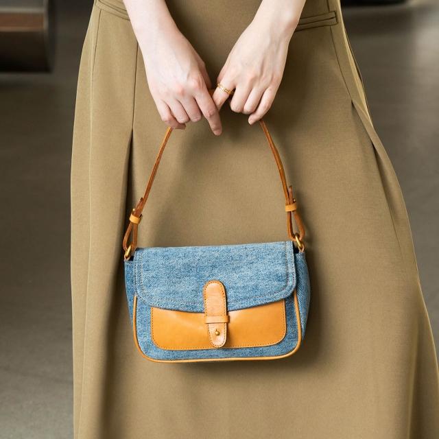 簡優 新款時尚女士斜挎包牛仔布拼接植鞣皮腋下包女包復古簡約休閑包包