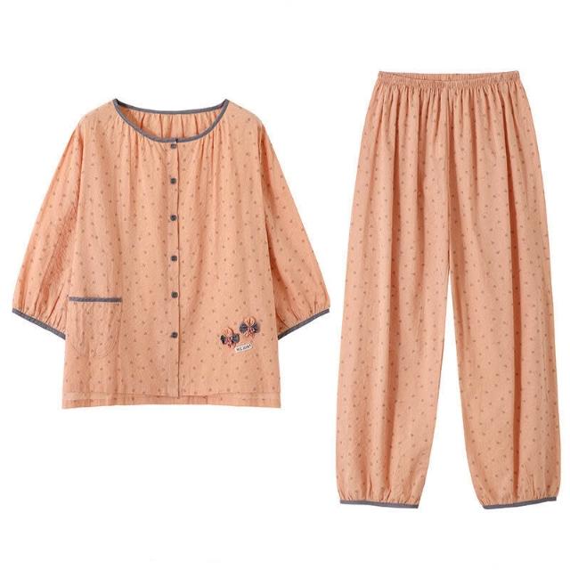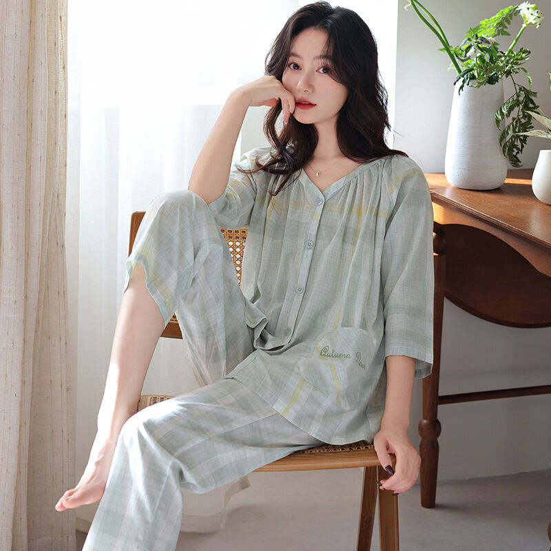 簡優 梭織純棉紗布睡衣女春夏季七分袖九分褲2026年新款夏天全棉家居服