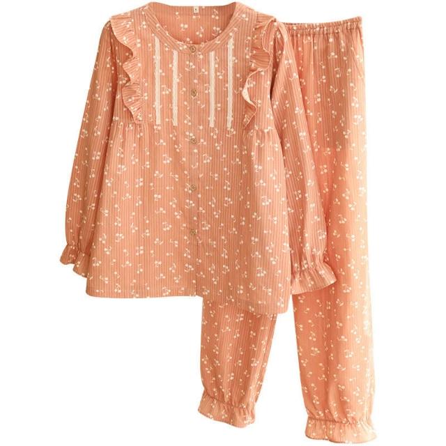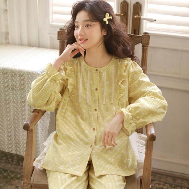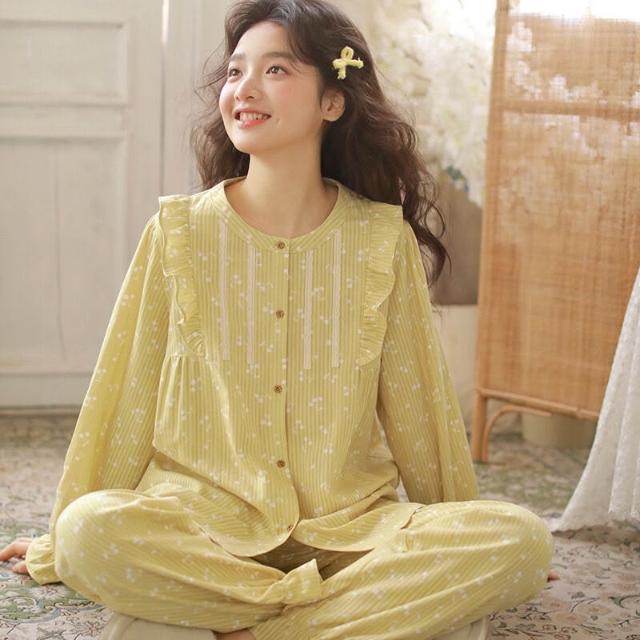 簡優 年春夏新品日系小花純棉棉紗印花長袖長褲睡衣女居家服套裝