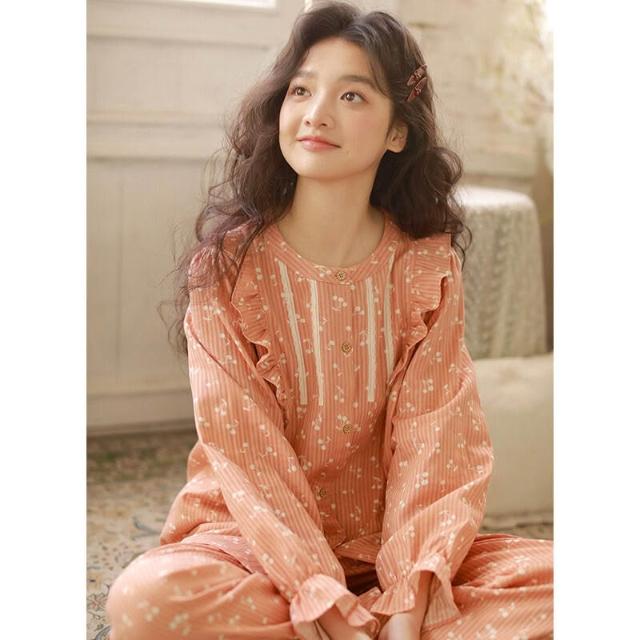 簡優 年春夏新品日系小花純棉棉紗印花長袖長褲睡衣女居家服套裝