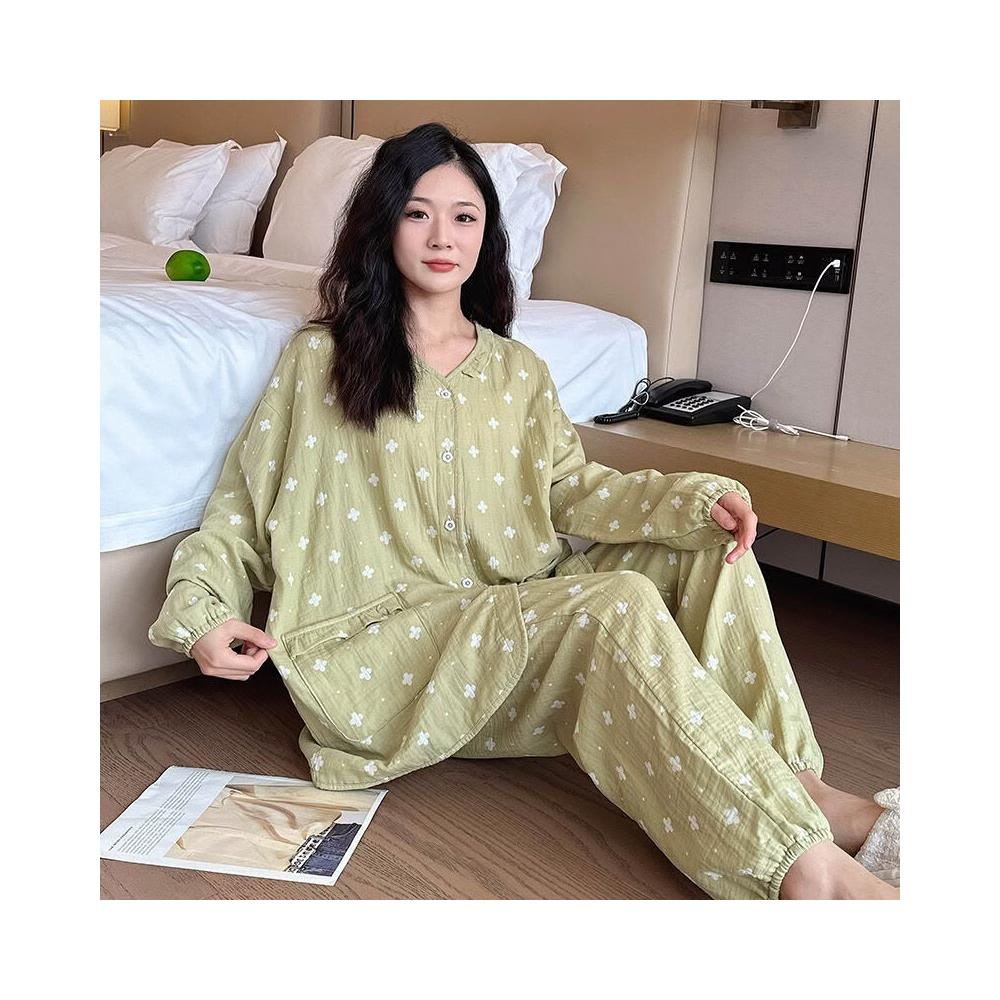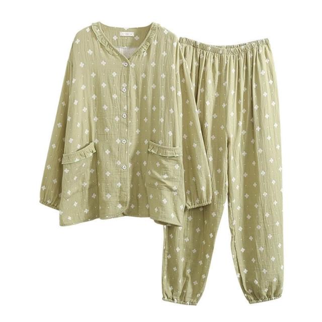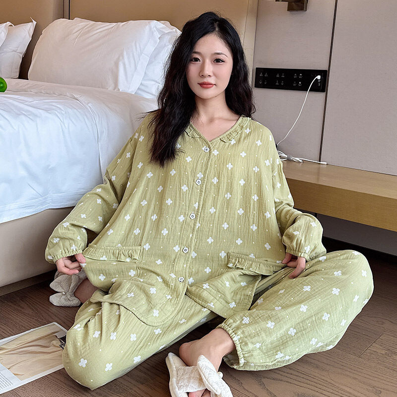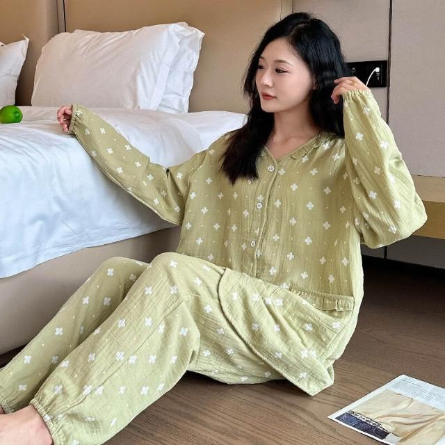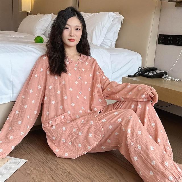 簡優 春秋款大碼純棉睡衣胖mm孕婦媽媽長袖印花家居服薄款休閑套裝批發