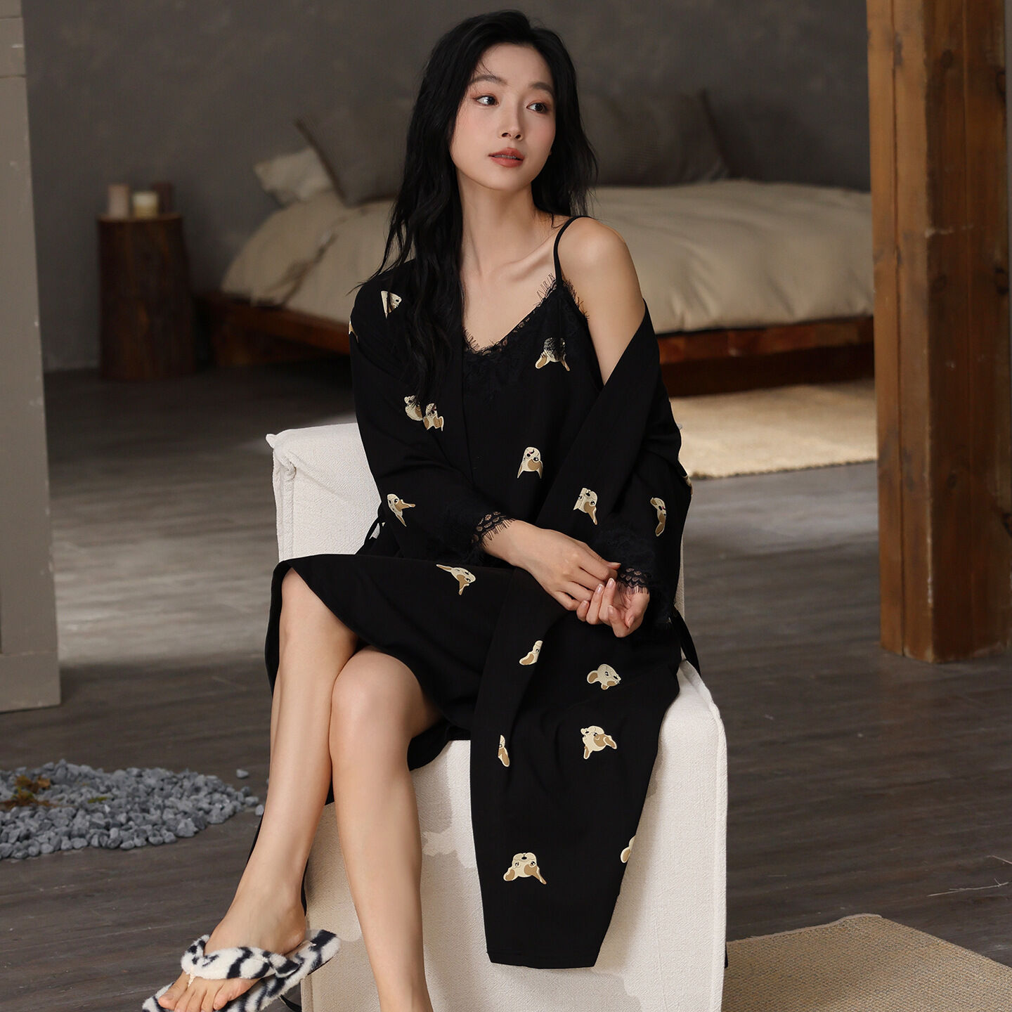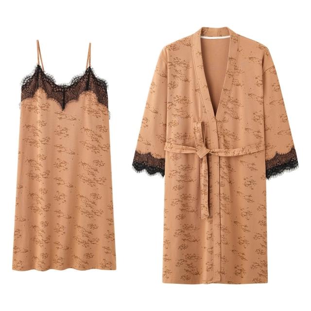 簡優 純棉吊帶睡裙睡袍春秋季蕾絲吊帶長袖高級感家居服兩件套