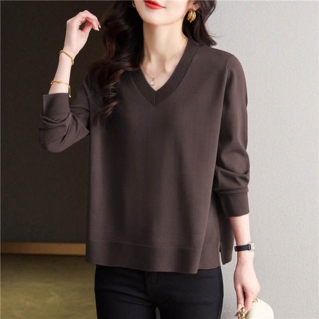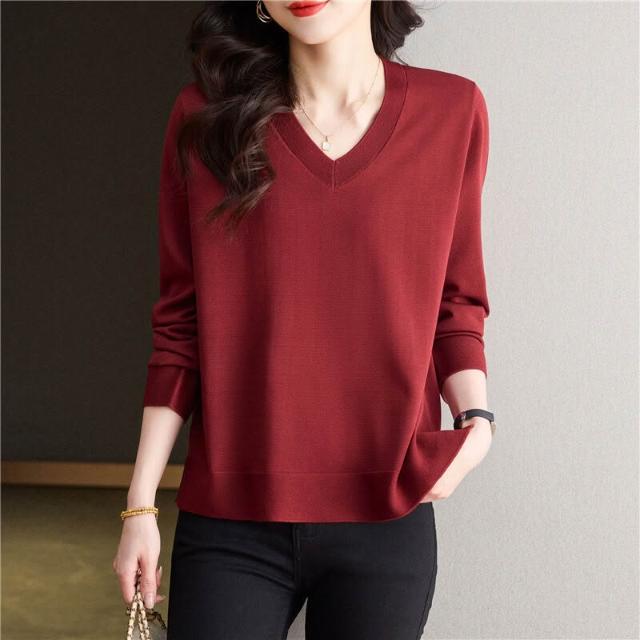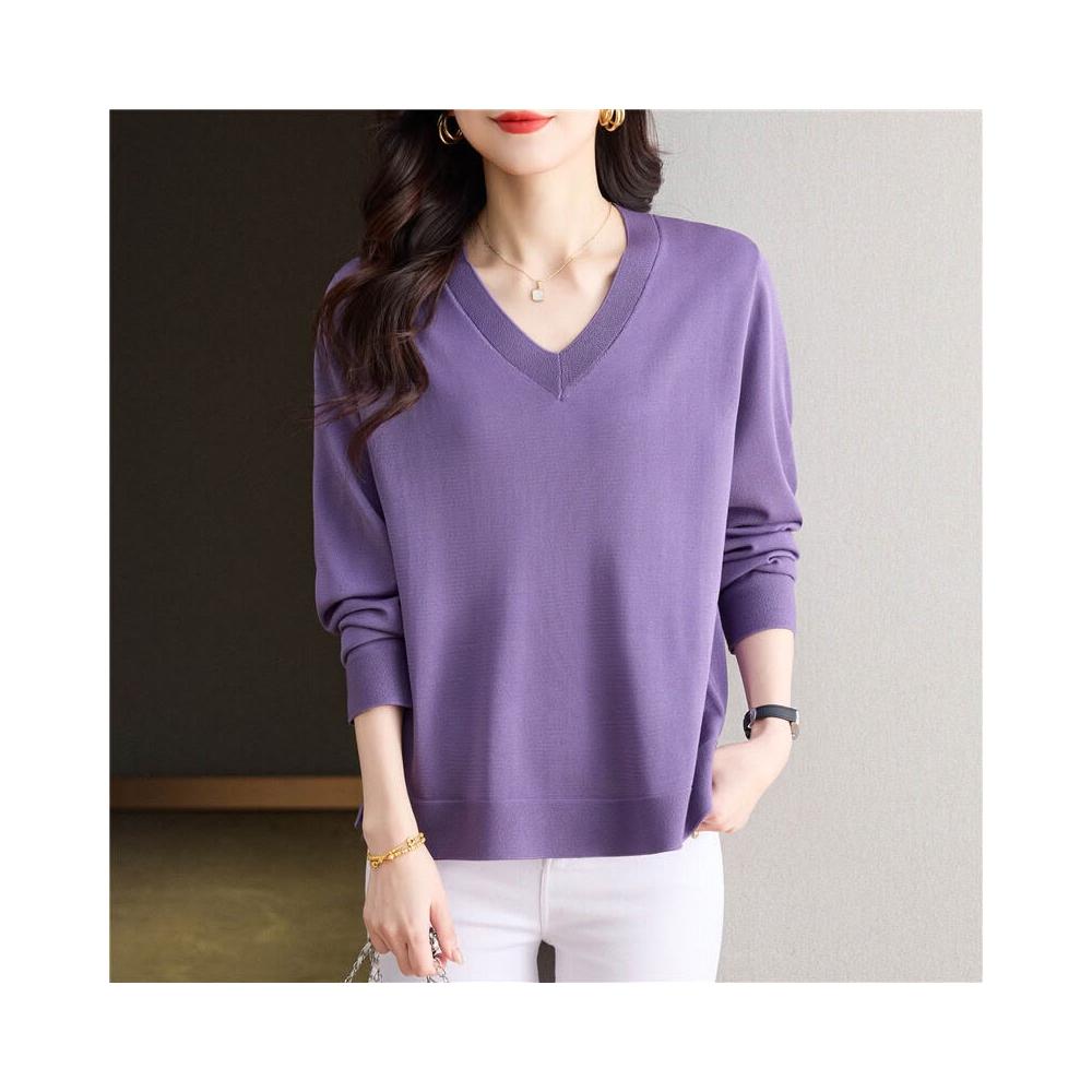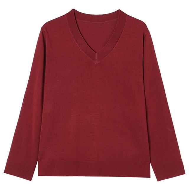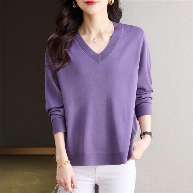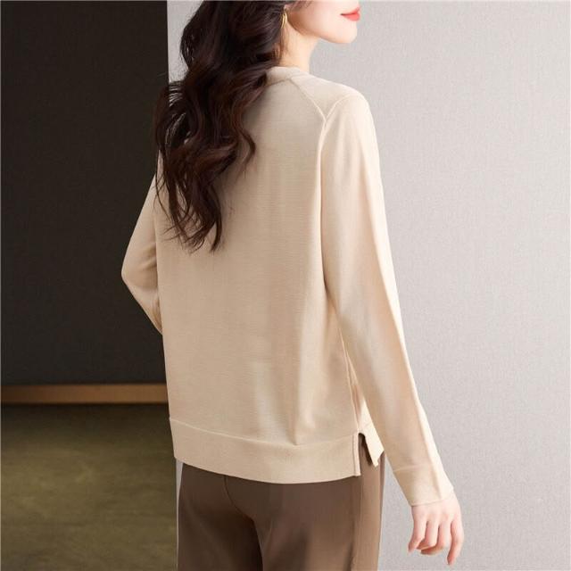 簡優 冰絲V領針織衫長袖t恤女裝2025款年輕媽媽春裝洋氣天絲打底衫上衣