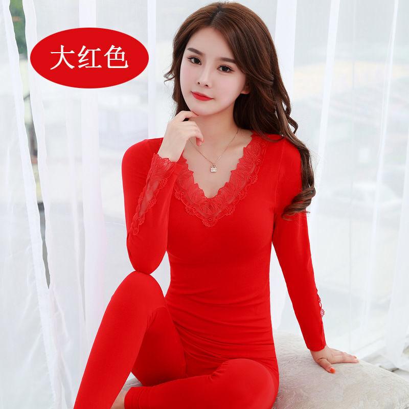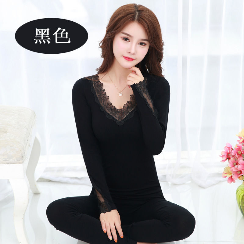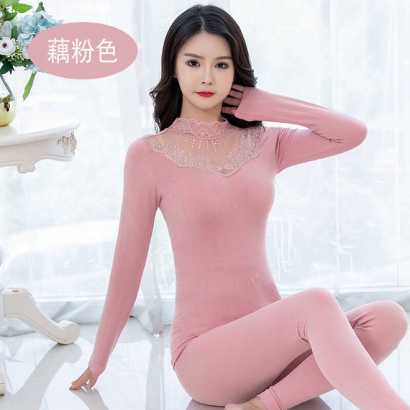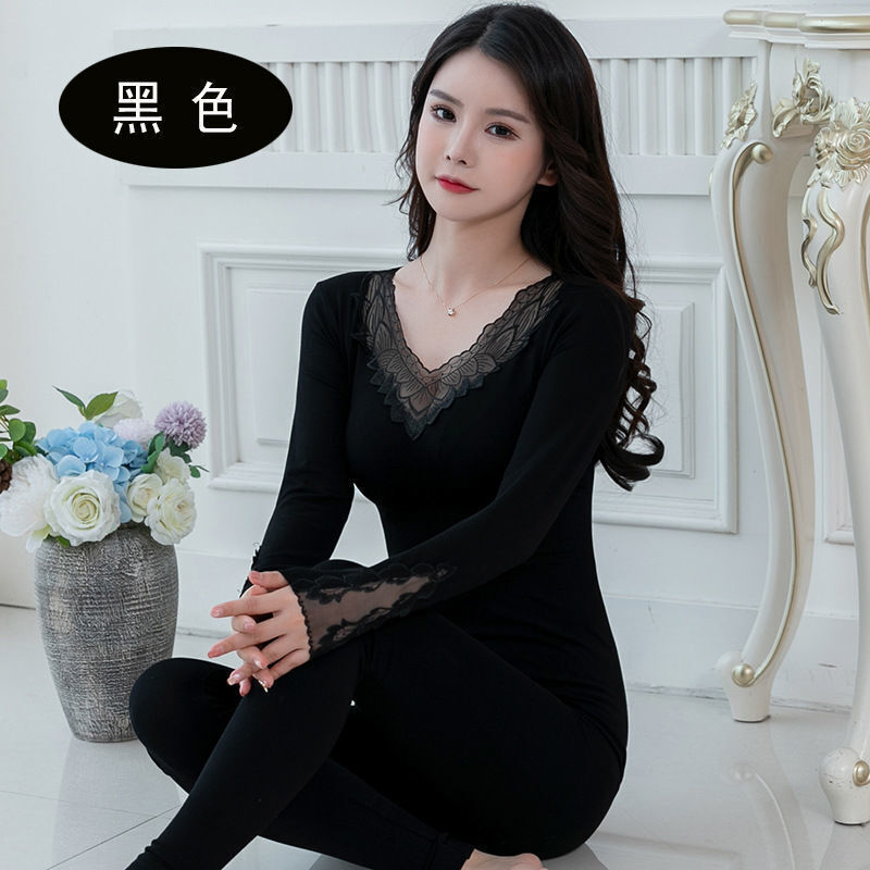 簡優 蕾絲領性感保暖內衣套裝女士薄款美體修身秋衣秋褲打底棉毛衫冬