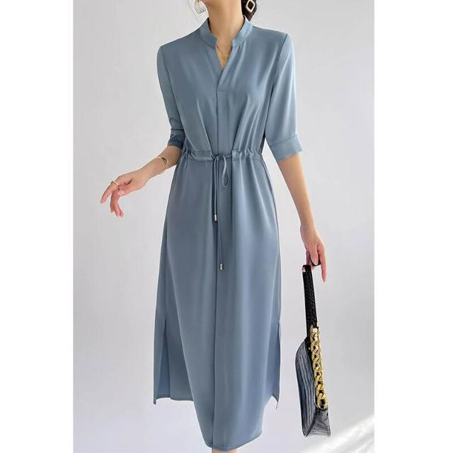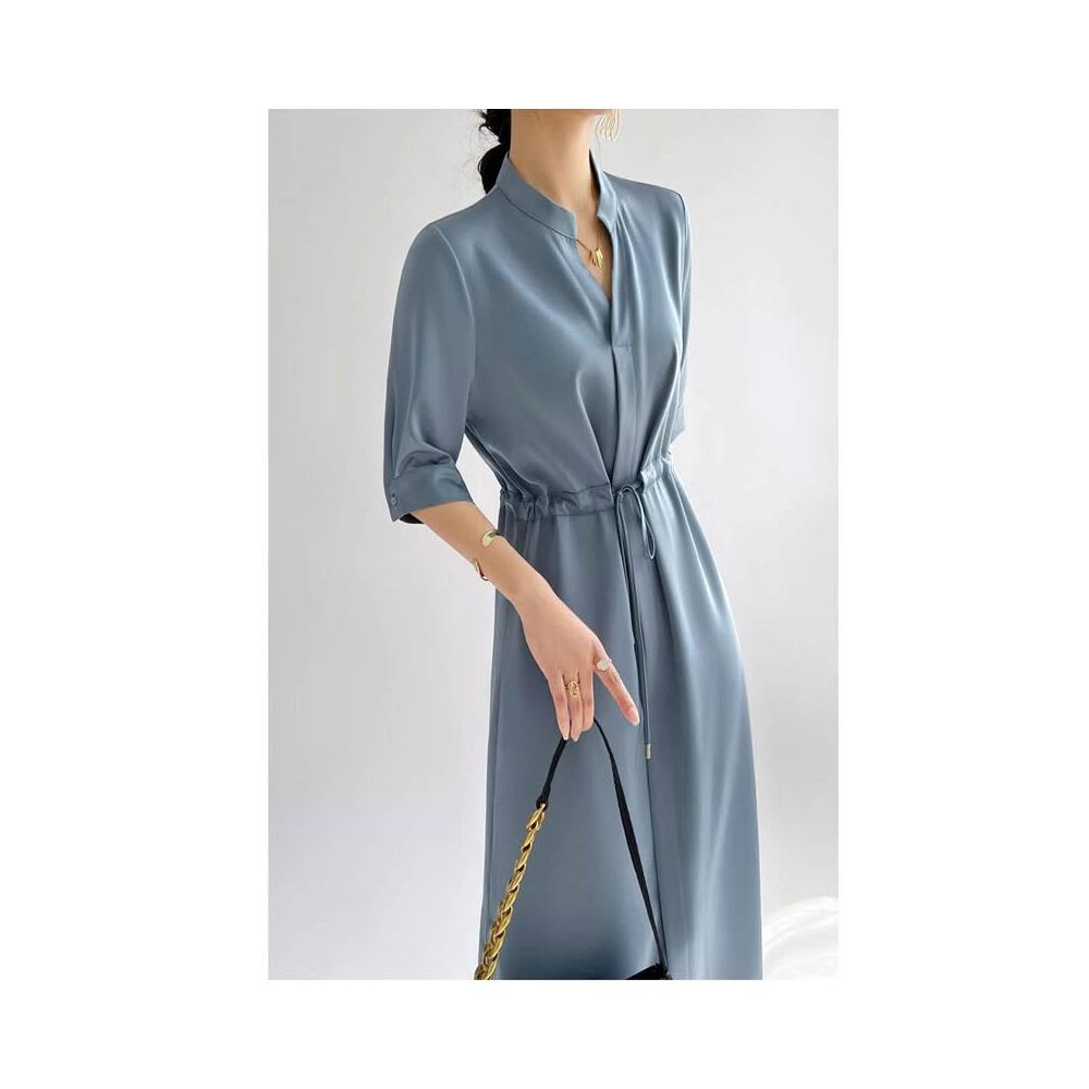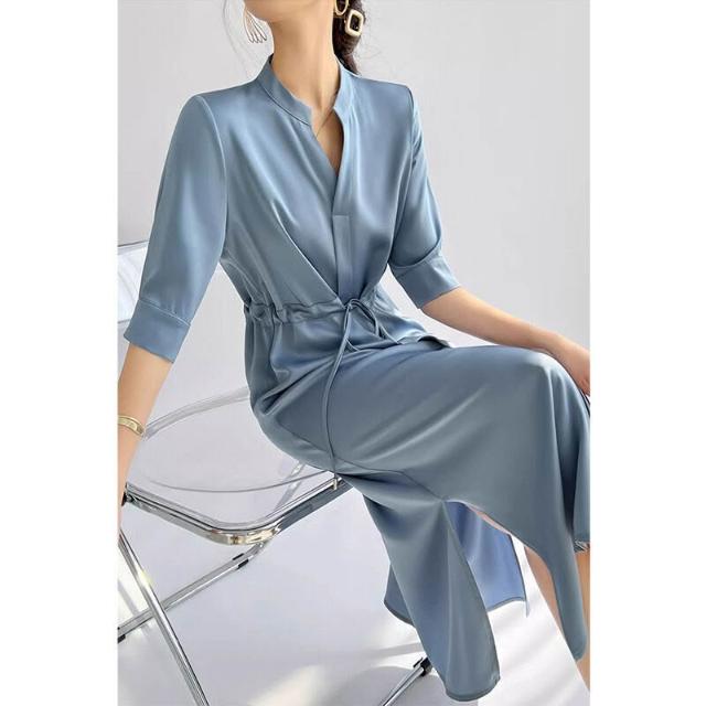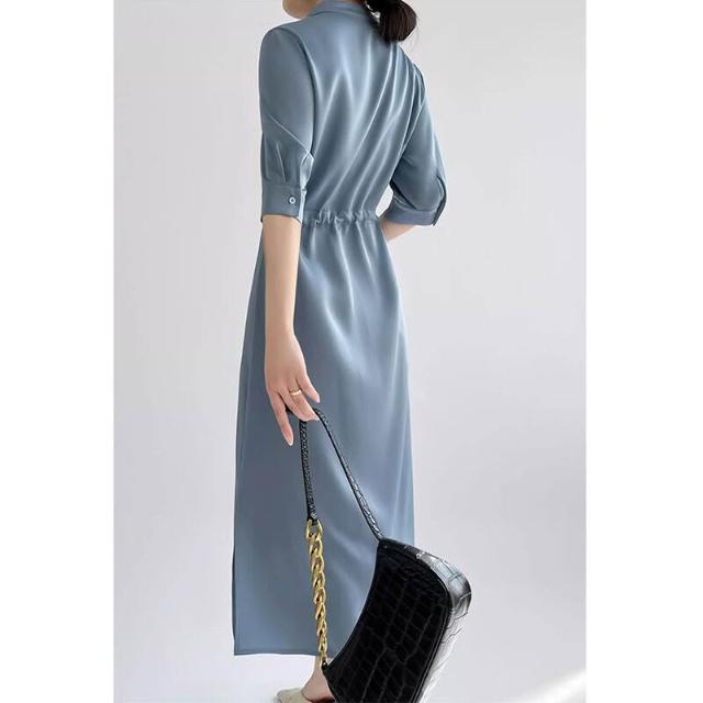 簡優 法式高級感連衣裙女2026夏季醋酸緞面收腰顯瘦中長款過膝襯衫裙子