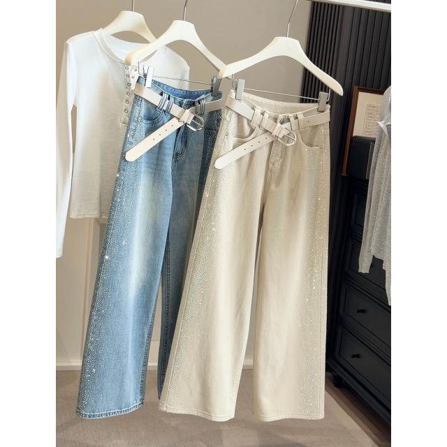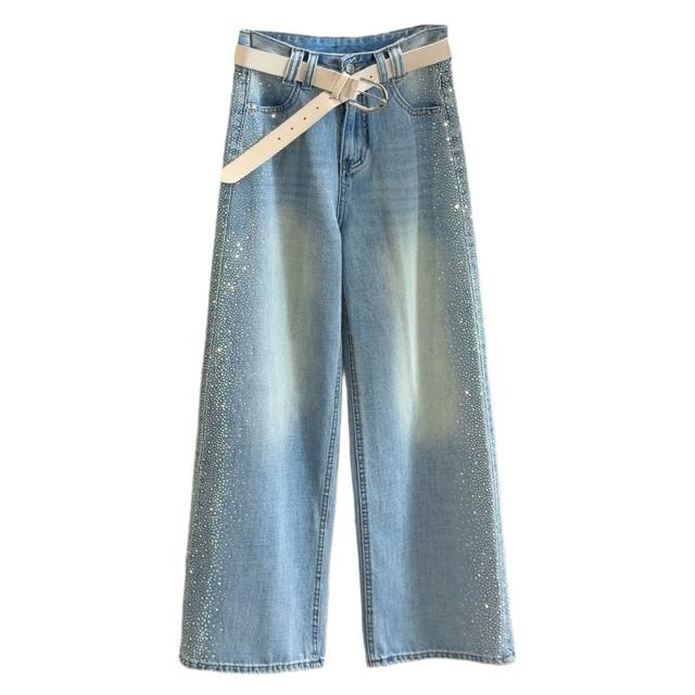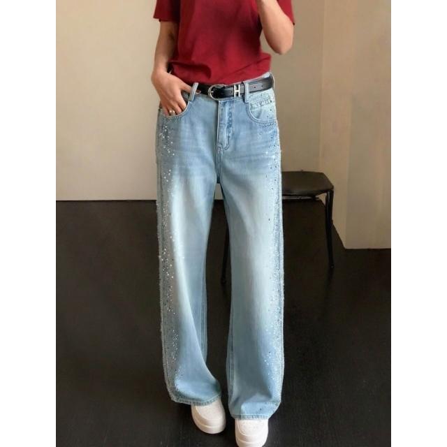 簡優 藍色滿天星重工燙鉆爆閃闊腿牛仔褲女春季新款高腰寬松顯瘦直筒褲