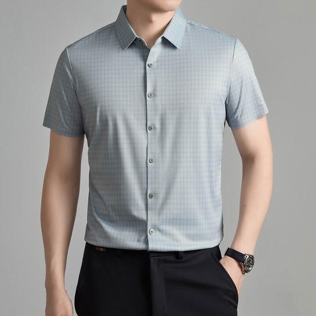 簡優 男士桑蠶絲短袖襯衫夏季高端無痕冰絲上衣商務潮流爸爸裝格子襯衣